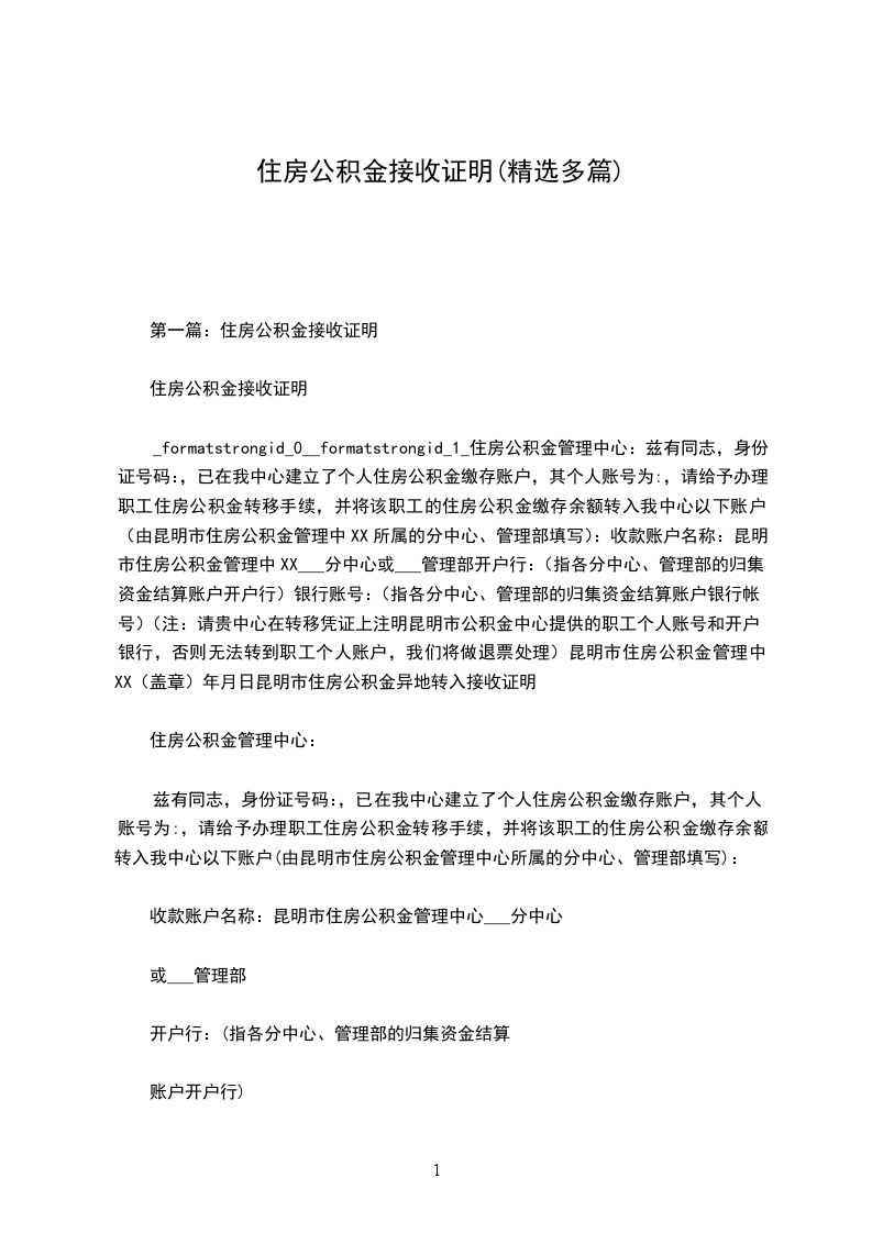 _formatstrongid_0__formatstrongid_1_住房公积金管理中心:兹有同志,身份证号码:,已在我中心建立了个人住房公积金缴存账户,其个人账号为:,请给予办理职工住房公积金转移手续,并将该职工的住房公积金缴存余额转入我中心以下账户(由昆明市住房公积金管理中XX所属的分中心、管理部填写):收款账户名称:昆明市住房公积金管理中XX___分中心或___管理部开户行:(指各分中心、管理部的归集资金结算账户开户行)银行账号:(指各分中心、管理部的归集资金结算账户银行帐号)(注:请贵中心在转移凭证上注明昆明市公积金中心提供的职工个人账号和开户银行,否则无法转到职工个人账户,我们将做退票处理)昆明市住房公积金管理中XX(盖章)年月日昆明市住房公积金异地转入接收证明