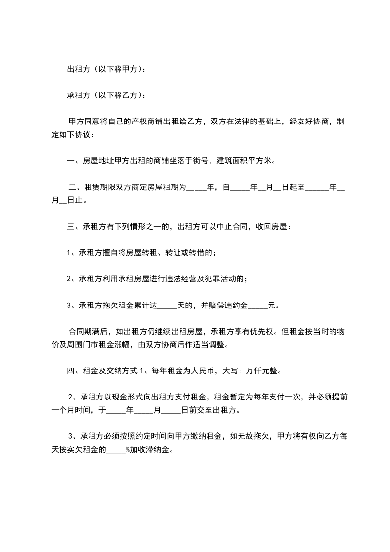 甲方同意将自己的产权商铺出租给乙方,双方在法律的基础上,经友好协商,制定如下协议: