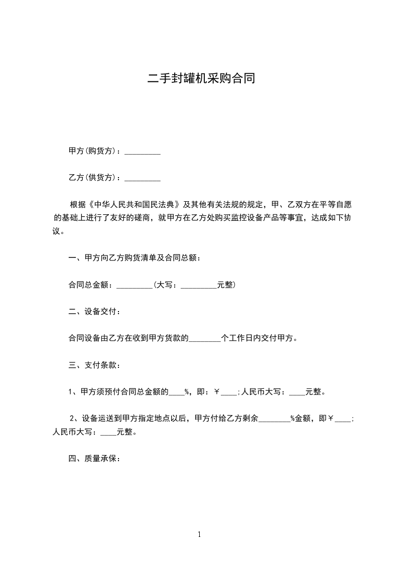 2.付款方式全部设备验收合格后的_______日内,甲方向乙方支付合同总金额的即元人民币整。若延期付款,甲方每天应向乙方缴纳延期额的千分之一作为罚金。合同总金额的余款即____________元人民币作为质保金,若设备运行正常,质保金在验收完成一年后的七日内一次性无息给付。