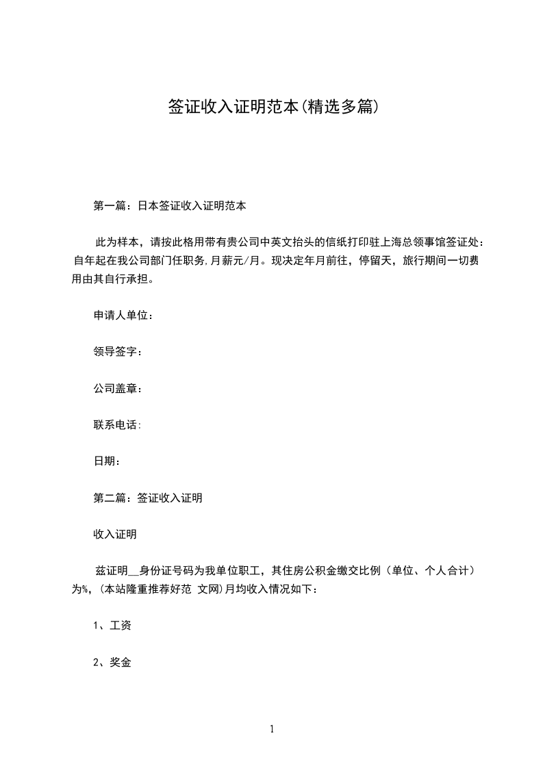 签证收入证明范本