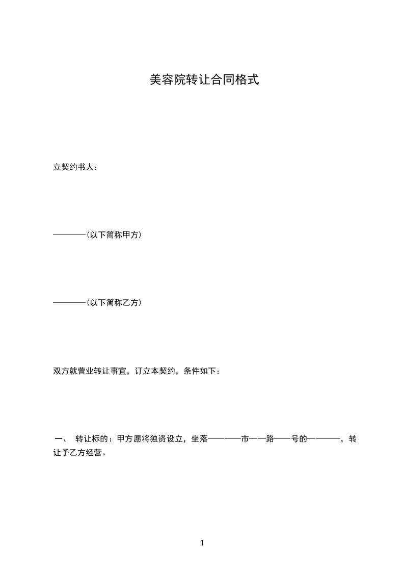 一、 转让标的:甲方愿将独资设立,坐落————市——路——号的————,转让予乙方经营。