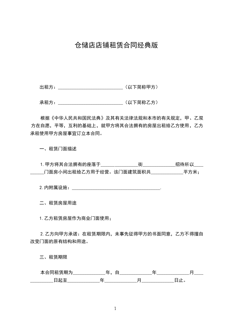 1.甲方将其合法拥有的座落于________________街______________招待所以__________门面房小间出租给乙方用于经营。该门面建筑面积共______________平方米;