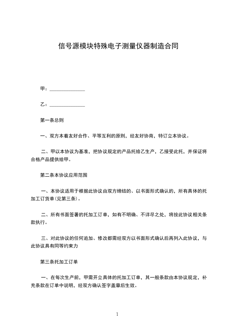 一、在每次生产前,甲需开立具体的托加工订单,其一般条款由本协议规定,补充条款在订单中说明,经双方确认签字盖章后生效。