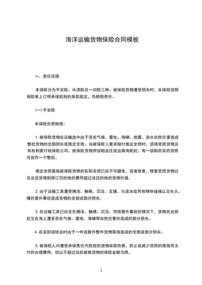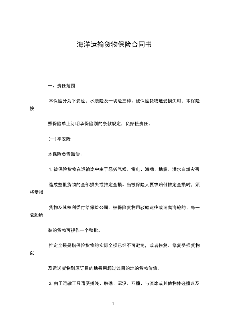 1.被保险货物在运输途中由于恶劣气候、雷电、海啸、地震、洪水自然灾害造成整批货物的全部损失或推定全损。当被保险人要求赔付推定全损时,须 将受损货物及其权利委付给保险公司。被保险货物用驳船运往或运离海轮的,每一驳船所装的货物可视作一个整批。推定全损是指被保险货物的实际全损已经不可避 免,或者恢复、修复受损货物以及运送货物到原订目的地的费用超过该目的地的货物价值。