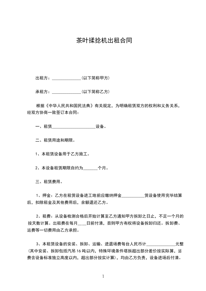 1、押金:乙方在租赁设备进工地前应缴纳押金___________赁设备使用完毕结算后,扣除租金及其他费用后,余额退还乙方。