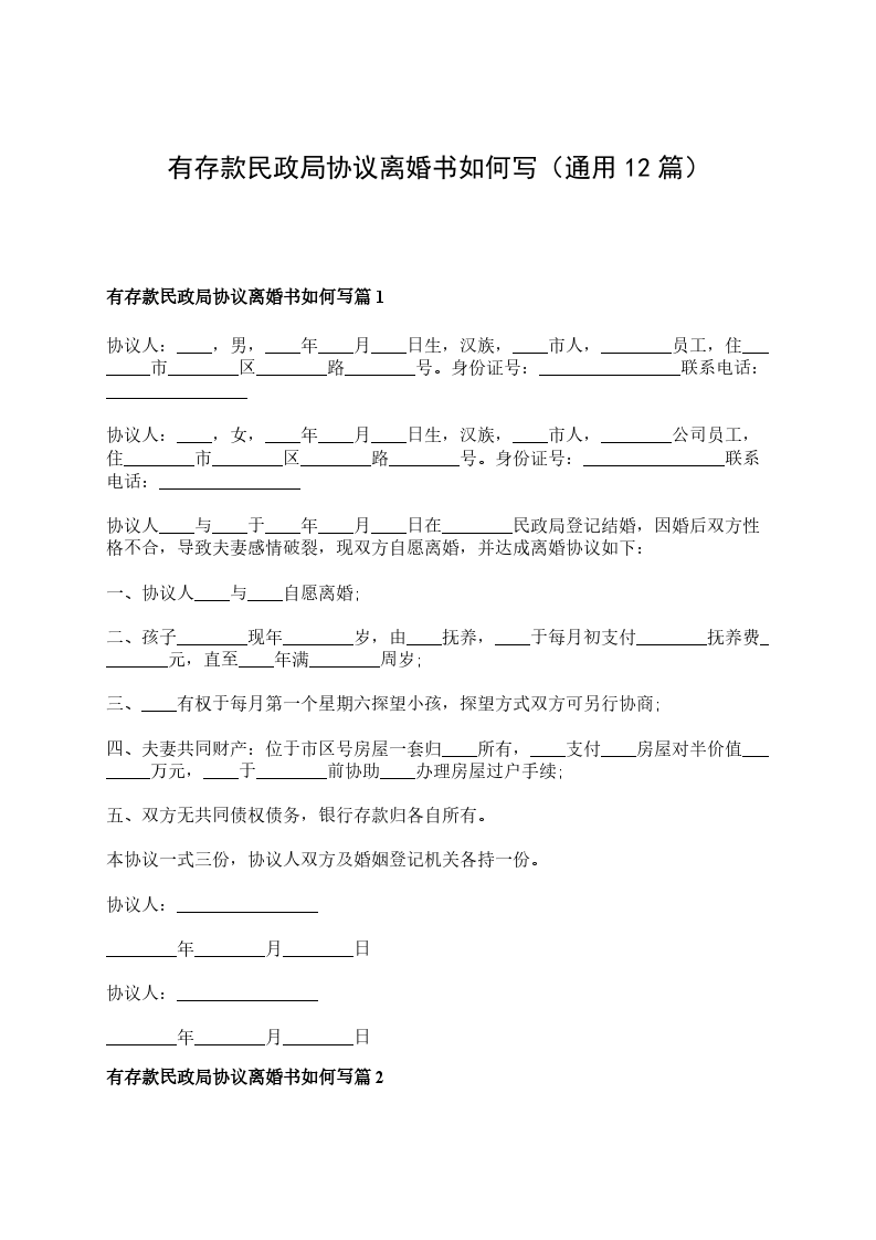 1、【存款】双方婚姻关系存续期间,目前共有存款____元,其中男方账户____元,女方账户____元,双方同意,____方在本协议签订之日起3日内给付____方____元。