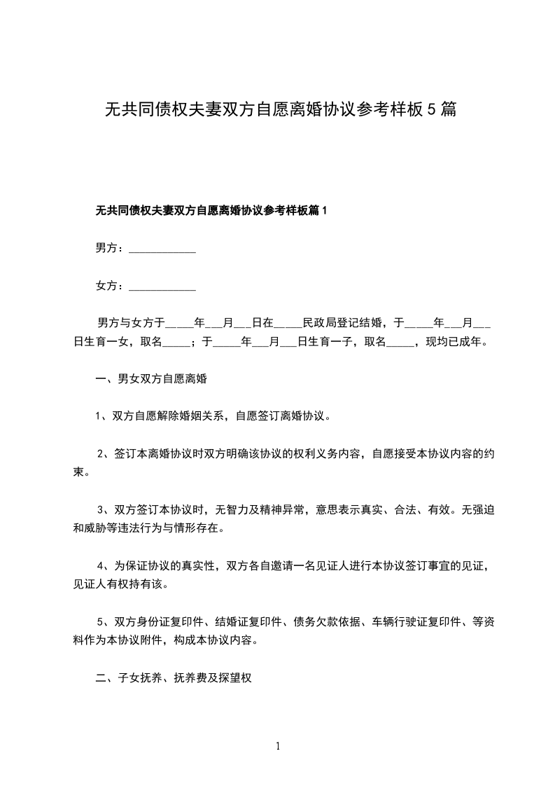 无共同债权夫妻双方自愿离婚协议参考样板篇1