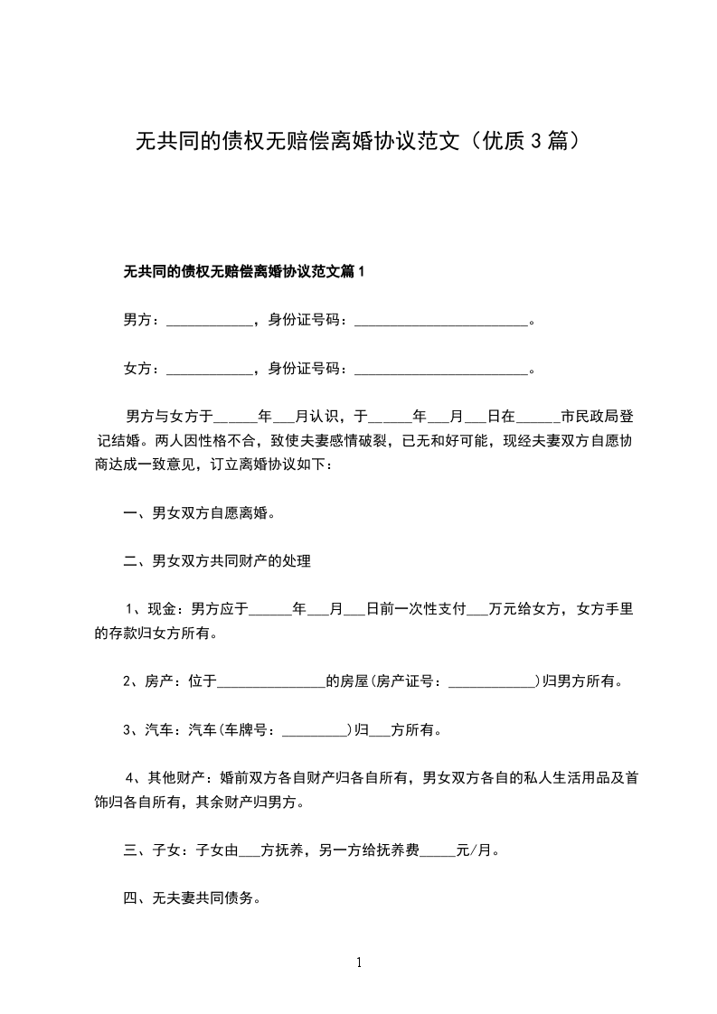 无共同的债权无赔偿离婚协议范文篇3
