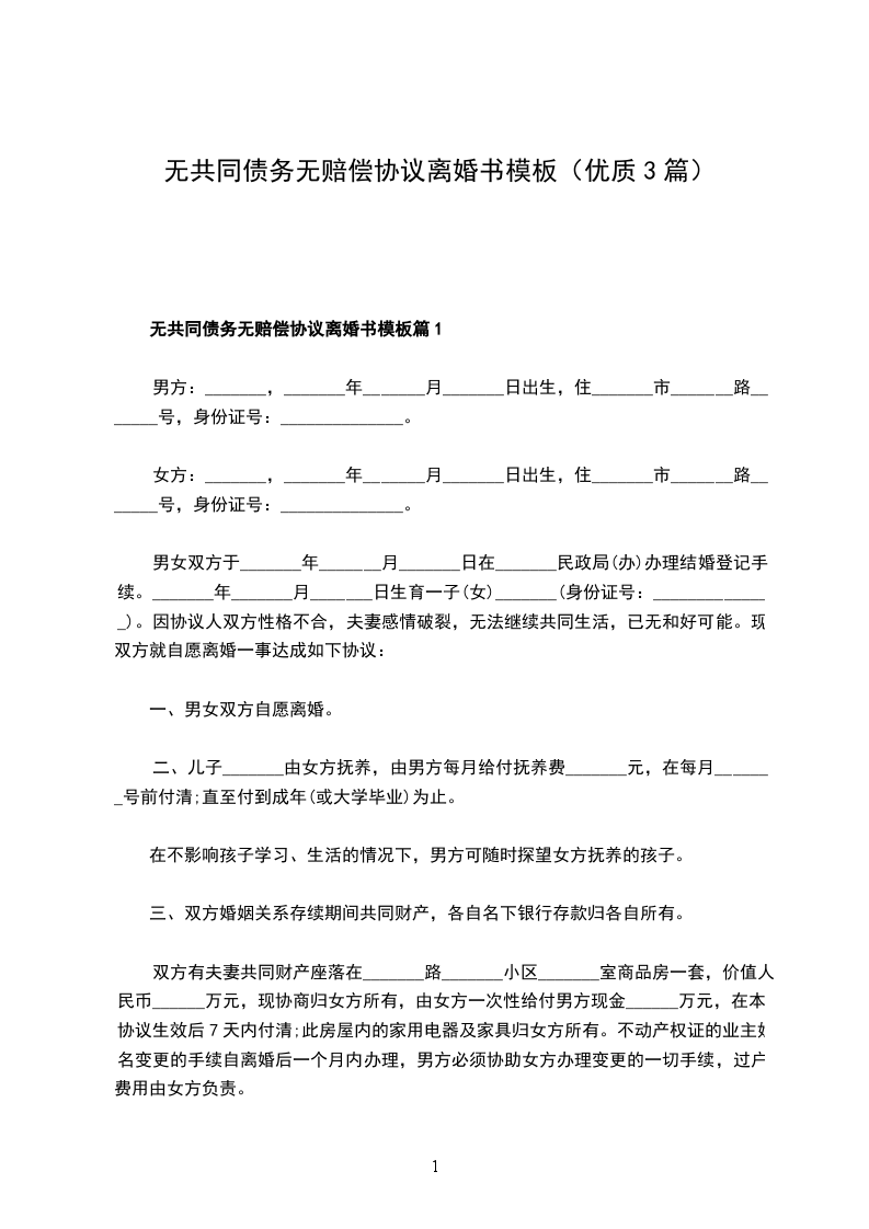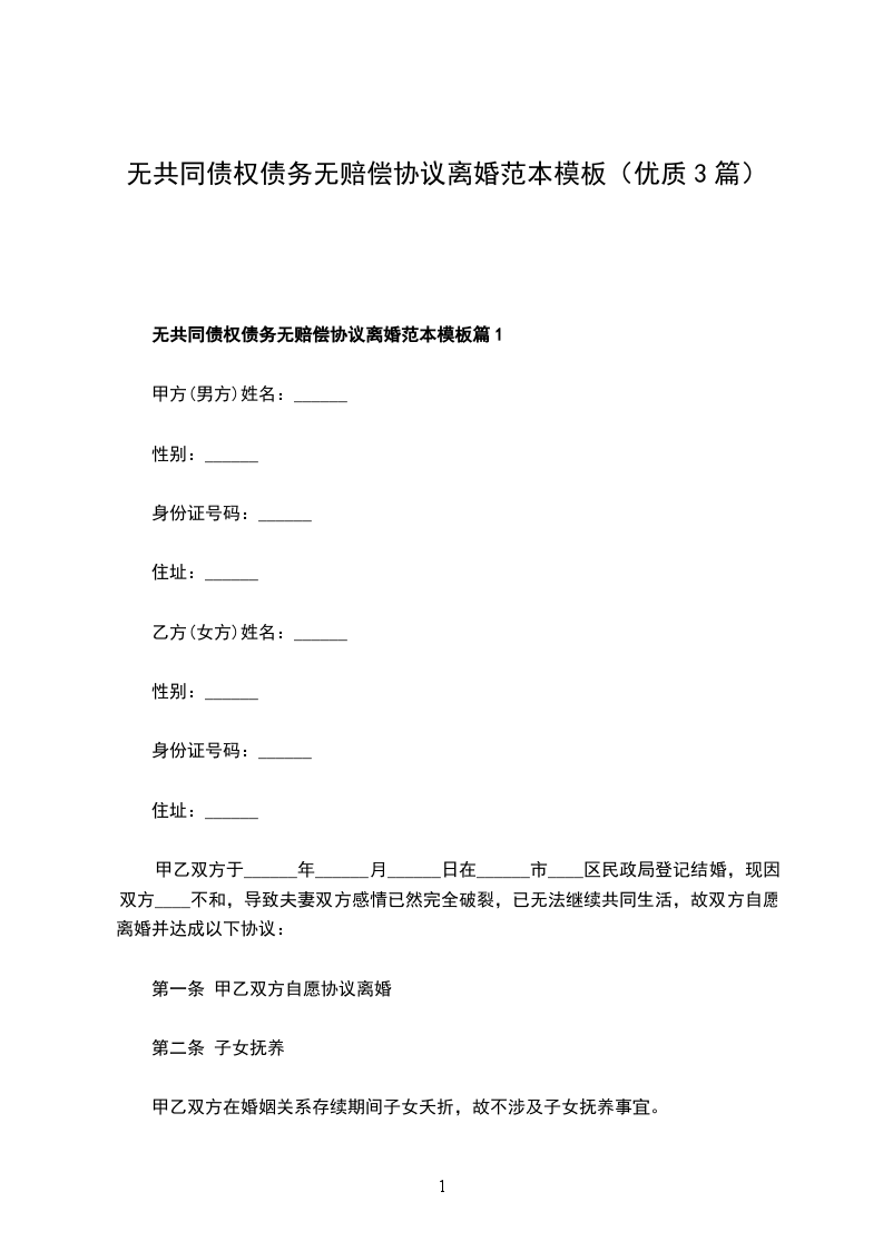 无共同的债权无赔偿离婚协议范文篇1