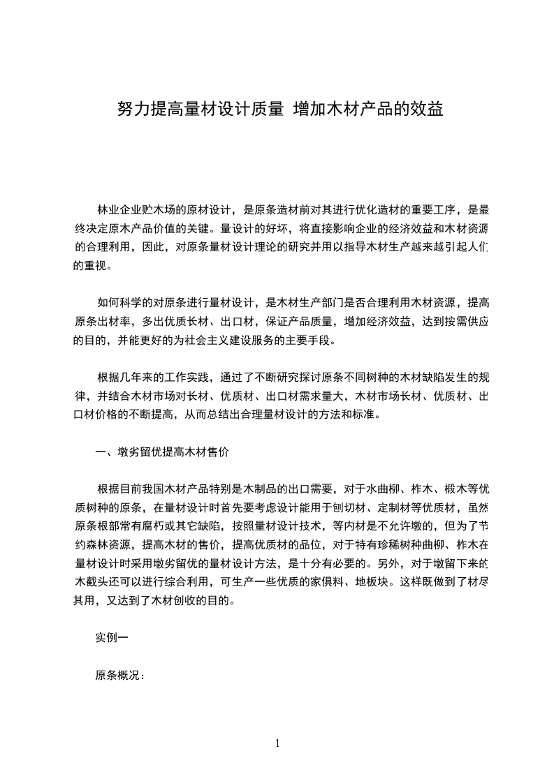 根据几年来的工作实践,通过了不断研究探讨原条不同树种的木材缺陷发生的规律,并结合木材市场对长材、优质材、出口材需求量大,木材市场长材、优质材、出口材价格的不断提高,从而总结出合理量材设计的方法和标准。