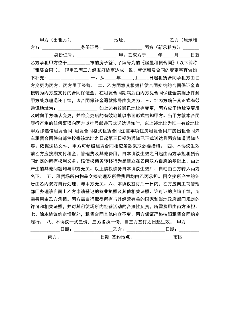 甲方(出租方):_________________地址:_________________ 乙方(原承租方):_________________身份证号:_________________ 丙方(新承租方):_________________身份证号:_________________ 甲、乙双方于_____年_____月_____日就乙方承租甲方位于__________市的房子签订了编号为的《房屋租赁合同》(以下简称“租赁合同”)。 现甲乙丙三方经友好协商达成一致,就该租赁合同的变更事宜做如下补充:_________________ 一、从_____年_____月_____日起租赁合同承租方由乙方变更为丙方,丙方用于经营。 二、乙方同意其根据租赁合同交纳的合同保证金直接转为丙方应支付的合同保证金,在租赁合同期满后由丙方凭合同保证金票据原件到甲方处办理退还手续,该合同保证金退款账号由变更为。三、经丙方确任其正式有效通讯地址为:_________________ 如上述有效通讯地址有变更,丙方应于地址变更后及时向甲方确认变更,并将变更后的有效地址以书面形式告知甲方。当甲方就本合同履行产生的任何事项向丙方以挂号邮递形式送达通知时,以上述地址为唯一有效地址,甲方邮递信租赁合同 租赁合同格式租赁合同注意事项住房租赁合同厂房出租合同汽车租赁合同件自邮件投寄该地址之日起第三日视为通知已正式送达且丙方知道通知内容。依据送达文件,甲方可参照租赁合同相应条款采取必要措施。 四、本协议生效前乙方应按期支付租金、管理费及其他费用,自本协议生效之日起由丙方承担租赁合同约定的所有权利义务。该债权债务转移行为是建立在乙丙双方自愿的基础上,由此产生的其他问题均与甲方无关。以上债权债务自本协议生效后,自动由乙方转入丙方名下。 五、租赁场所内物品交接处理及所需费用均由乙丙承担。因交接所产生的纠纷由乙丙双方自行处理,与甲方无关。六、本协议签订后十日内,乙方应向工商管理部门办理该店面上乙方申请登记的营业执照及其他相关证照、许可证的注销手续,所需费用由乙方承担。丙方需自行取得所有与其经营有关的国家和当地政府部门规定的许可和相关证照,并对其租赁场所内经营活动的合法性负责,所需费用由丙方承担。 七、除本协议约定情形外,租赁合同其他内容不变,丙方保证严格按照租赁合同约定履行。 八、本协议一式三份,三方各执一份,自三方签订之日起生效。 甲方:_________________日期:_________________乙方:_________________日期:_________________丙方:_________________日期 签约地点:_________________市区