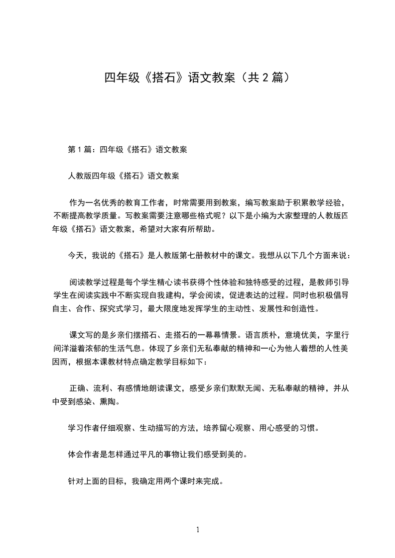 作为一名优秀的教育工作者,时常需要用到教案,编写教案助于积累教学经验,不断提高教学质量。写教案需要注意哪些格式呢?以下是小编为大家整理的人教版四年级《搭石》语文教案,希望对大家有所帮助。