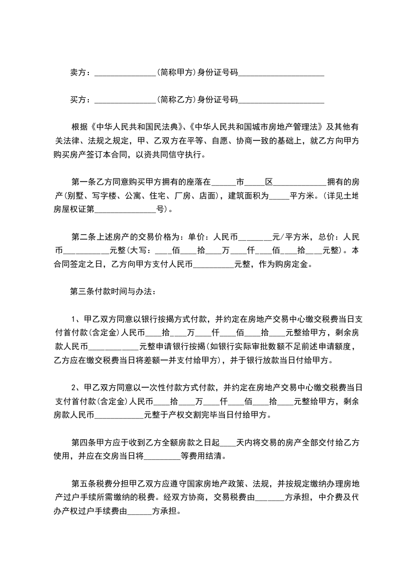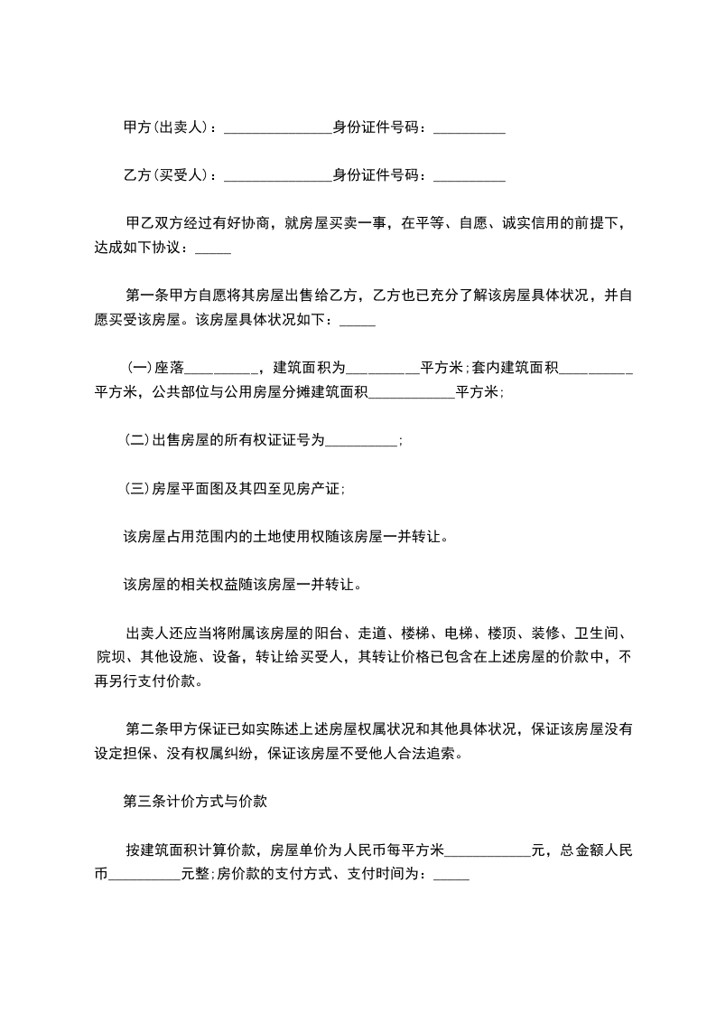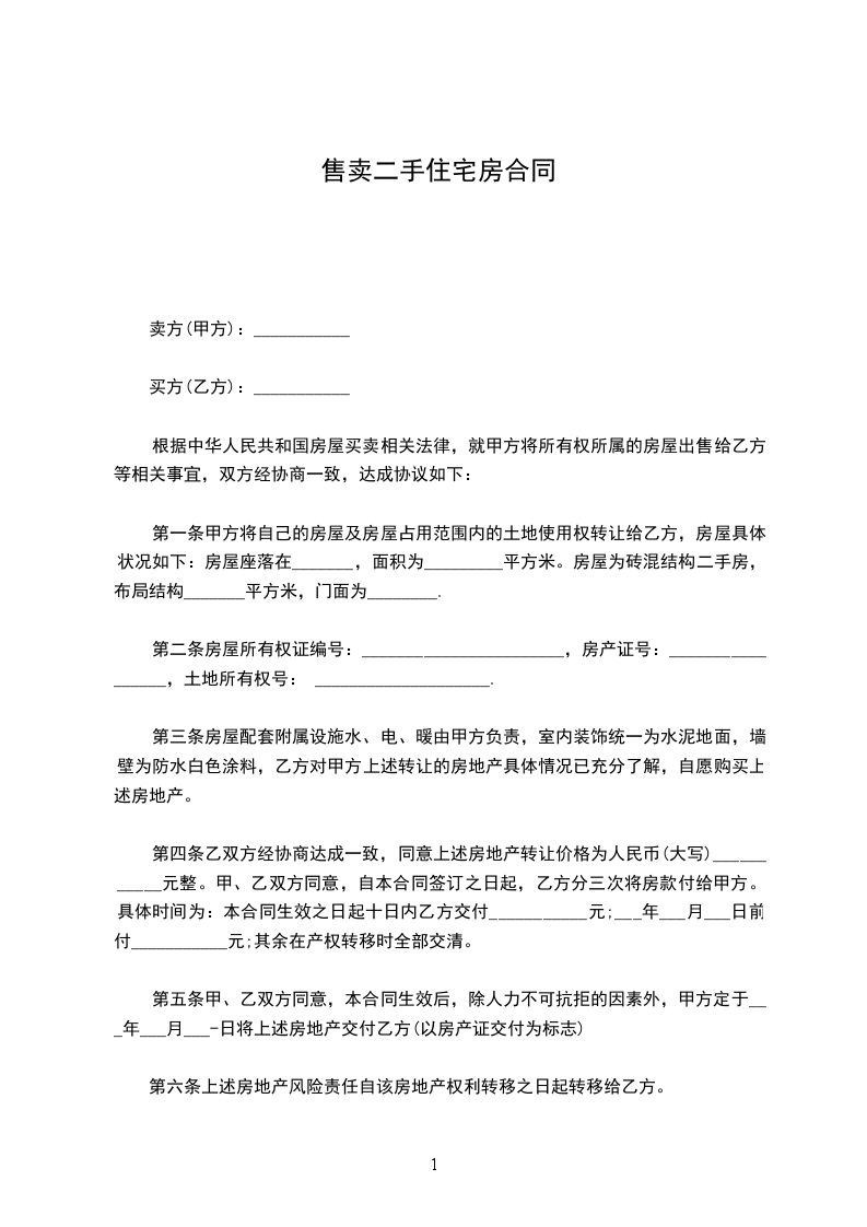 【二手房买卖合同协议书】 甲方(卖方):_________________ 乙方(买方):_________________ 甲、乙双方就房屋买卖事项,经协商一致,达成以下合同条款:_________________ 一、甲方自愿将坐落在_______________房产出卖给乙方,并将与所出卖该房产的相关的土地使用权,同时出卖给乙方。(附平面图) 二、双方议定上述房地产及附属建筑物总价款为人民币大写________________,即人民币小写_________________。 三、乙方在签订本合同时,支付定金,即小写___________________。 四、乙方支付定金之日起_____________个月内,向甲方支付首付款(定金从中扣除)。 五、甲方保证该房产合法、权属清楚、有合法的土地使用权。 六、乙方支付首付款后,甲方即积极配合乙方办理有关房产公证手续,待房产公证到乙方名下之时,乙方应向甲方付清全部房款余额。 七、甲方应在公证前将该房产交付乙方;届时该房产应无任何担保、抵押、房产瑕疵,无人租住、使用;无欠账,如电话费、水电费、入网费、有线电视费等。 八、本合同签订后,如一方违反本合同条款,该方应向对方支付_______________元的违约金;一方如不能按规定交付房产或按规定支付房款,每逾期一日,应向对方支付_______________元罚金,逾期30日视为毁约。 九、附加条款:_________________ 十、本合同一式三份,甲乙各一份,公证一份,具有同等法律效力,自双方签字之日生效。(共3页) 甲方(卖方):_________________ (印)身份证号:_________________ 住址:_________________ 电话:_________________ 乙方(买方):_________________ (印)身份证号:_________________ 住址:_________________ 电话:_________________ ________年______月_____日