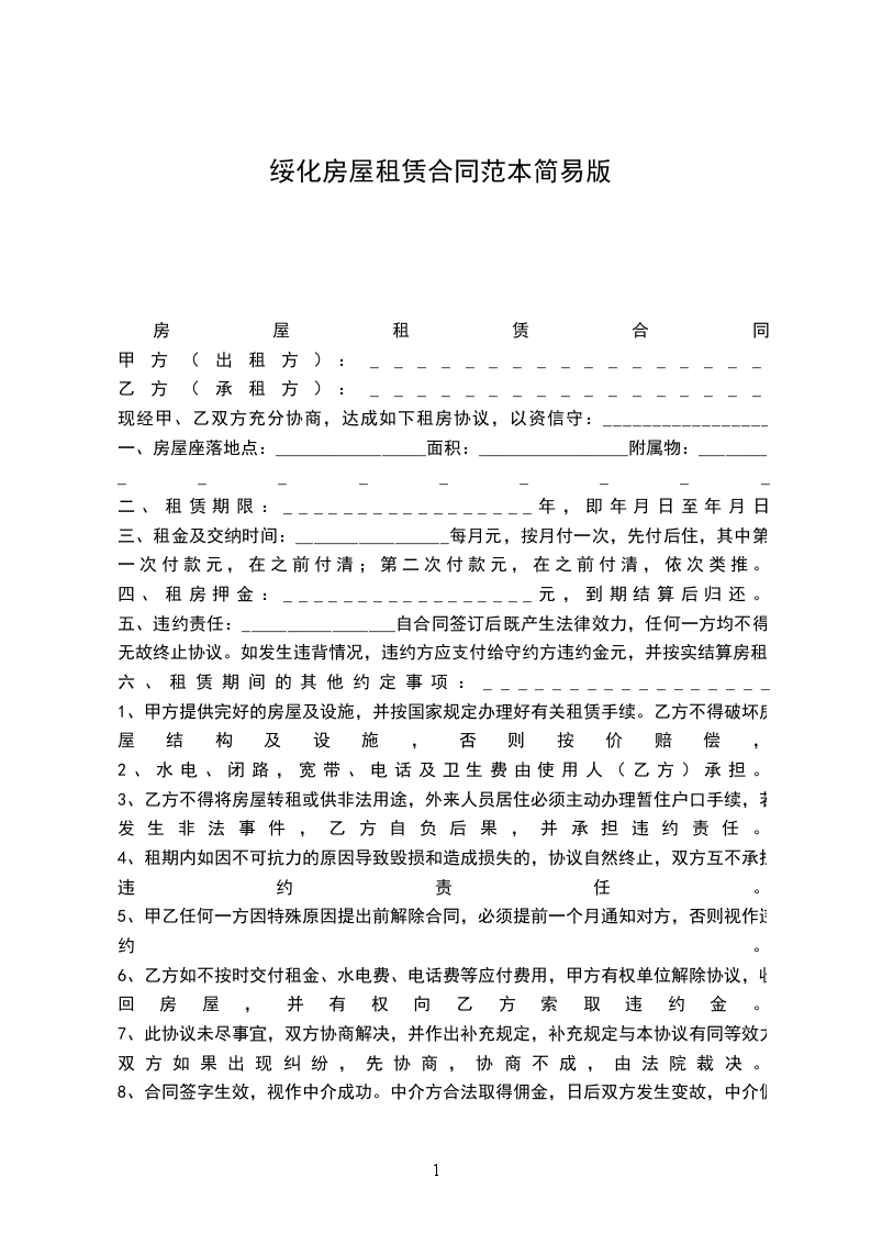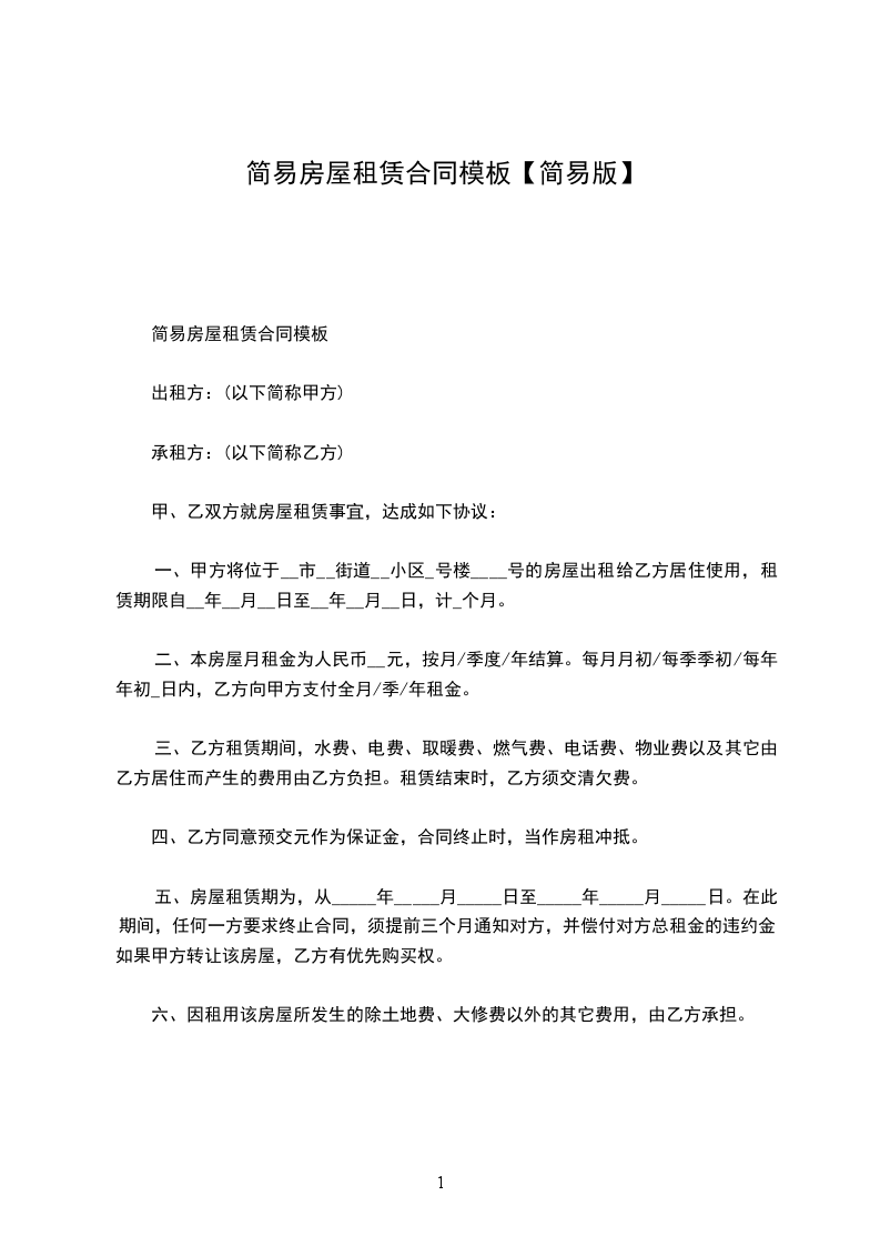 五、违约责任:_________________自合同签订后既产生法律效力,任何一方均不得无故终止协议。如发生违背情况,违约方应支付给守约方违约金_____元,并按实结算房租。