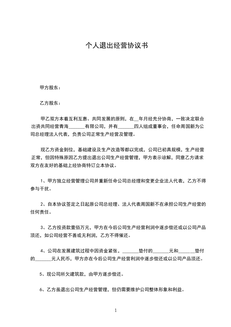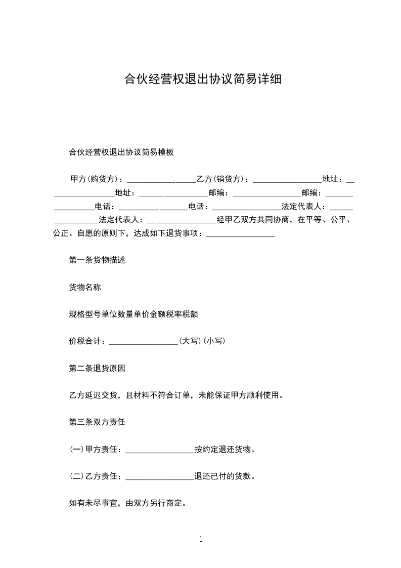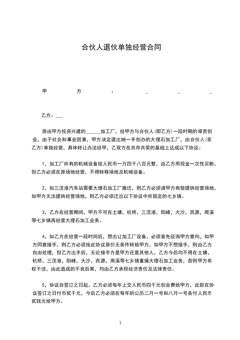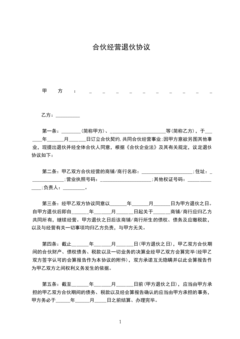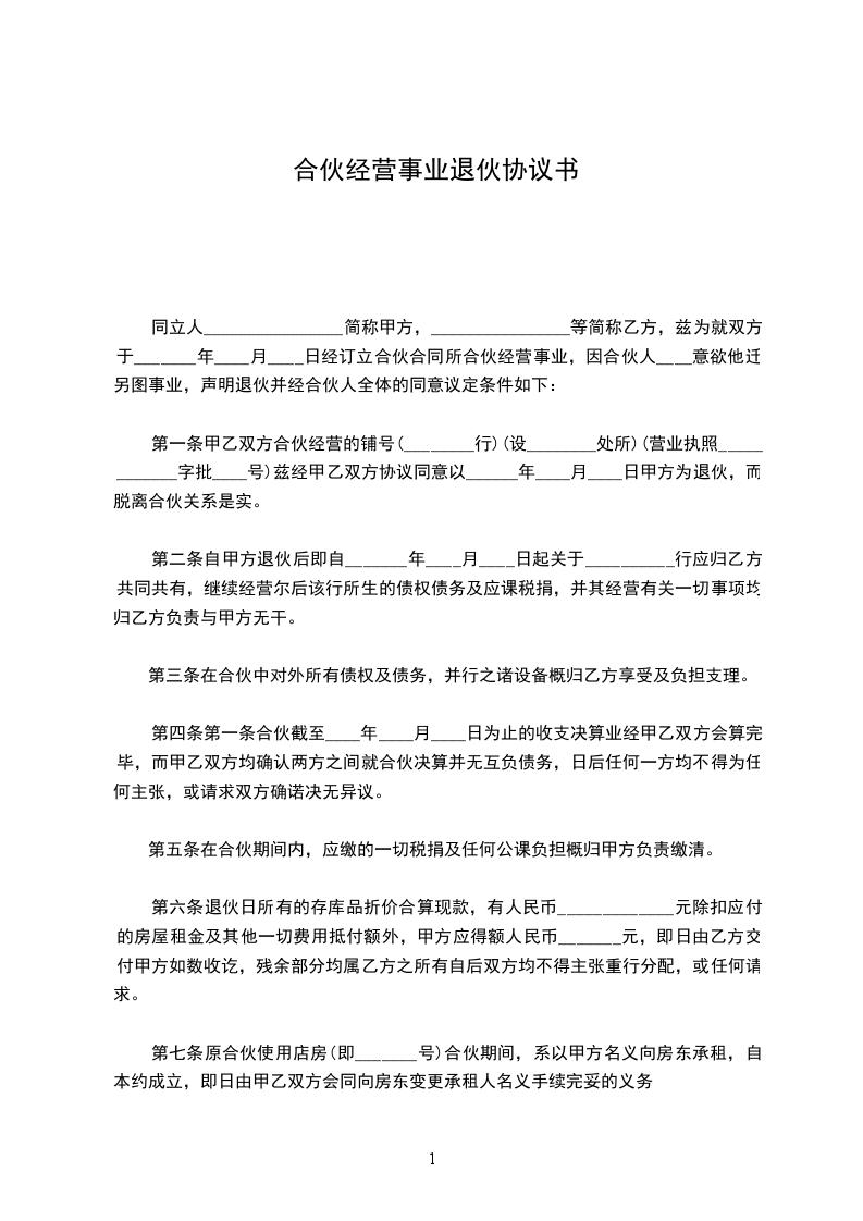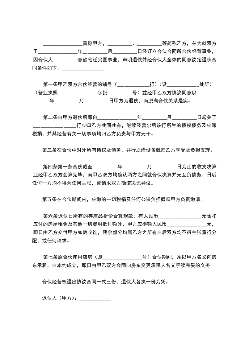 第一条甲乙双方合伙经营的铺号(_____________行)(设_____________处所)(营业执照________________字批__________号)兹经甲乙双方协议同意以_______________年__________月__________日甲方为退伙,而脱离合伙关系是实。
