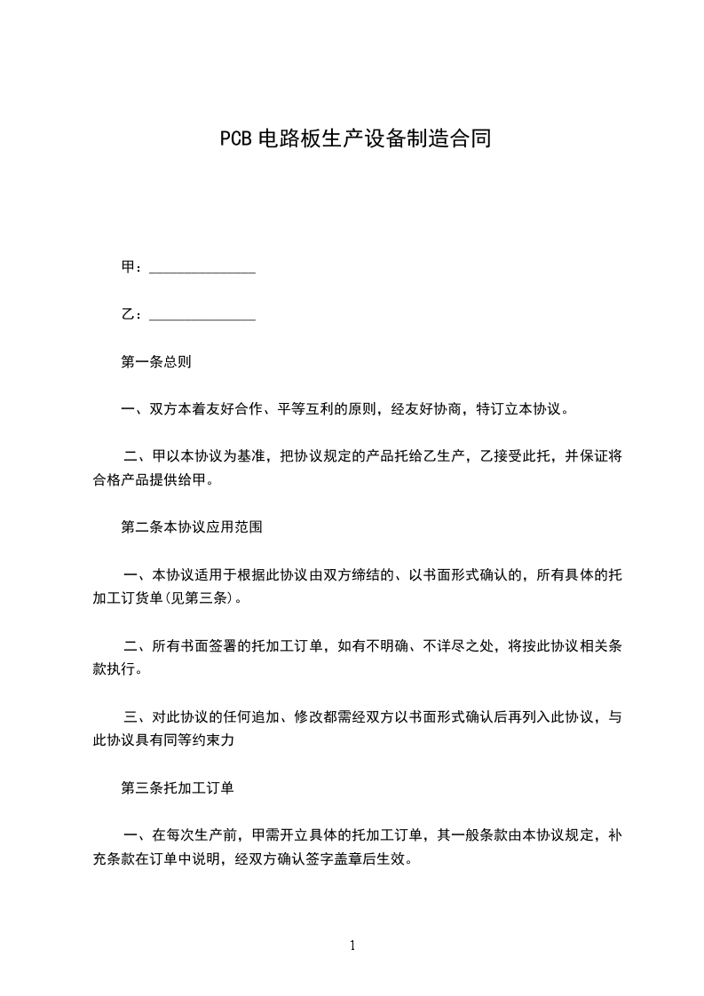 一、本协议适用于根据此协议由双方缔结的、以书面形式确认的,所有具体的托加工订货单(见第三条)。