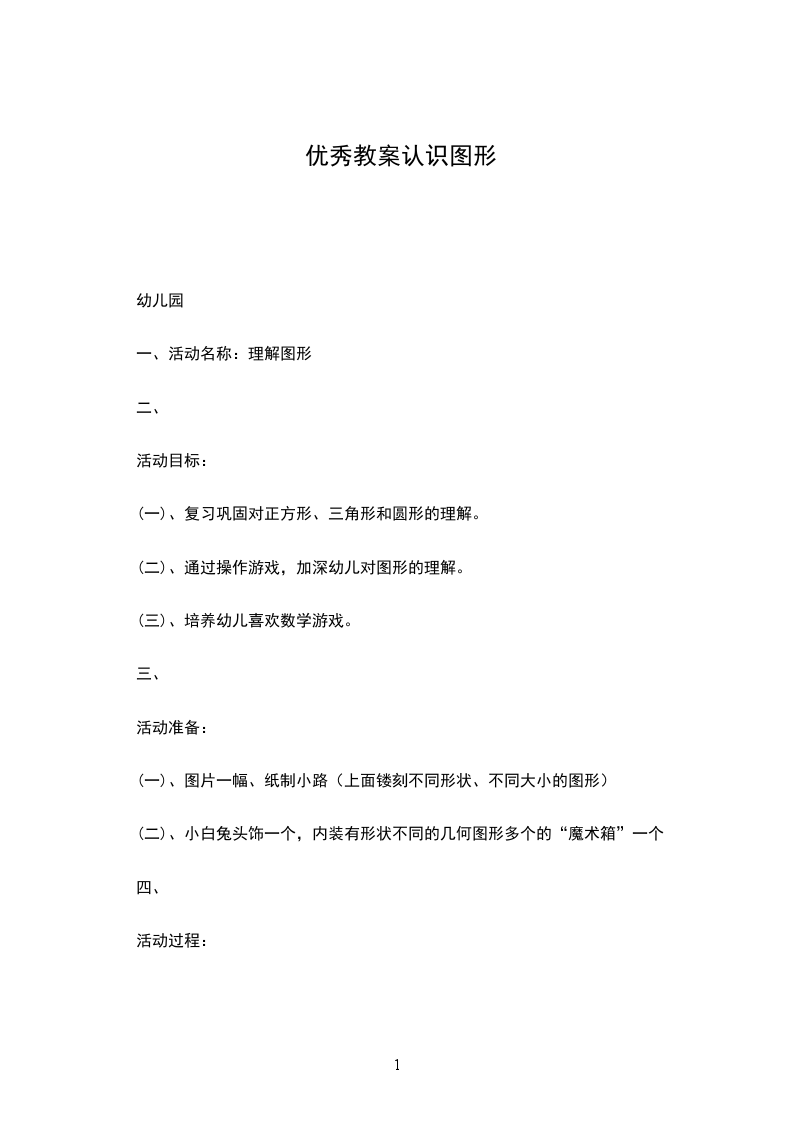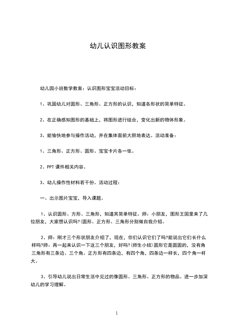 1、认知目标:通过观察操作,初步认识长方形、正方形、三角形和圆体,体会面在体上