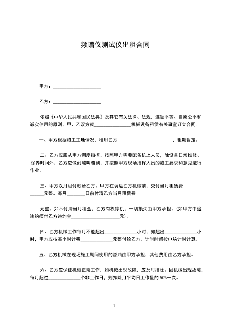 依照《中华人民共和国民法典》及其它有关法律、法规,遵循平等、自愿公平和诚实信用的原则,甲、乙双方就________________机械设备租赁有关事宜订立合同.