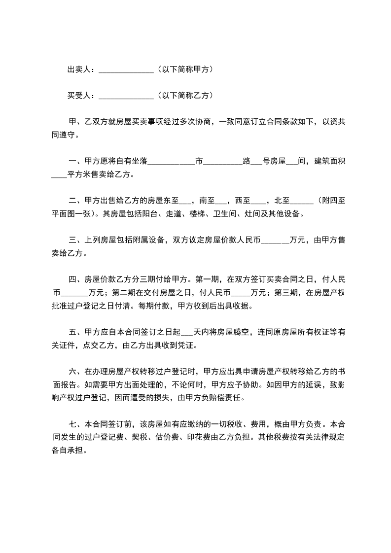 四、房屋价款乙方分三期付给甲方。第一期,在双方签订买卖合同之日,付人民币_______万元;第二期在交付房屋之日,付人民币_____万元;第三期,在房屋产权批准过户登记之日付清。每期付款,甲方收到后出具收据。