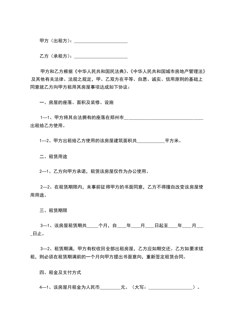 1—1、甲方将其合法拥有的座落在郑州市__________________________________出租给乙方使用。