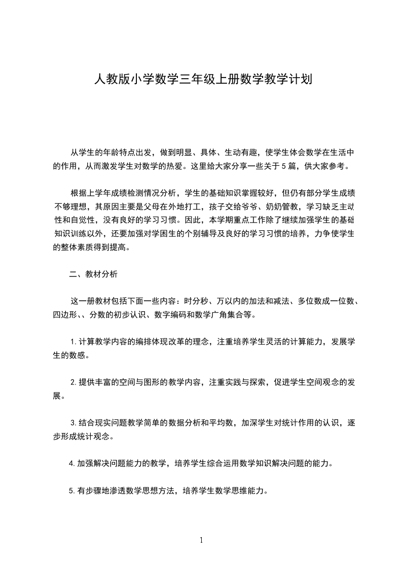 一、情况分析(一)班级情况分析:1、本班共有学55人,其中男生30人,女生25人,从上学年考试成绩分析,学生的基础的知识、概念掌握还算牢固,口算及乘法口诀掌握还好。但粗心大意的还比较多,灵活性不够,应用能力较差。但总的来说大部分学生对数学比较感兴趣,但接受能力不强,学习不够主动,也有部分学生自觉性不够,不能及时完成作业等,对于学习数学有一定困难。所以在新的学期里,在端正学生学习态度的同时,应加强培养他们的各种学习数学的能力,以提高成绩。2、本班级学困生也不少,如:麦XX、陈X、李XX、周XX、陈XX等学生。这些同学自觉性不够,缺乏刻苦钻研的精神,总想偷懒,不做作业或者抄别人的作业。今后首先还是加强学习习惯培养,如学前的预习、课后的复习等。在书写上还要继续提高要求,只有让学生在认真书写的基础上才有可能认真思考。因此要在本学期的教育教学中培养孩子的良好学习习惯,增强孩子的自信心,探寻良好的学习方法,采用各种激励机制,让孩子迎头赶上。就是“蜗牛”也就能往上爬。(二)教材分析本学期教材是课改的第一年,教学内容有些调整,内容包括时分秒万以内的加法和减法测量倍的认识多位数乘一位数数字编码长方形和正方形分数的初步认识数学广角(集合)等。本册教材的重点教学内容是万以内的加法和减法笔算、多位数乘一位数以及四边形,所以培养他们的计算能力及空间思维能力是关键。在教学中加强数学数量关系的分析,让学生学会分析,学会审题,提高解题能力。最后在激发学生学习兴趣方面多寻找方法,使他们乐学,愿学。二、本学期教学的指导思想1、改进笔算教学的编排,体现计算教学改革的理念,重视培养学生的数感。2、量与计量的教学联系生活实际,重视学生的感受和体验。3、空间与图形的教学,强调实际操作与自主探索,加强估测意识和能力的培养。4、提供丰富的现实学习素材,体现知识的形成过程。5、逐步发展学生综合运用知识的能力,注重情感、态度、价值观的培养。三、本学期教学的主要目的要求(一)知识和技能方面1、会正确笔算三位数的加、减法,会进行相应的估算和验算。2、会口算一位数乘整十、整百数;会笔算一位数乘二、三位数,并会进行估算。3、初步认识简单的分数(分母小于10),会读、写分数并知道各部分的名称,初步认识分数的大小,会计算简单的同分母分数的加减法,会解决简单的有关分数的实际问题。4、会区分和辨认四边形,掌握长方形和正方形的特征,会在方格纸上画长方形、正方形;知道周长的含义,会计算长方形、正方形的周长;能估计一些物体的长度,并会进行测量。5、认识长度单位毫米、分米和千米,初步建立1毫米、1分米和1千米的长度观念,知道1厘米=10毫米、1分米=10厘米、1千米=1000米;认识质量单位吨,初步建立1吨的质量观念,知道1吨=1000千克,会进行简单的换算,会恰当地选择单位;认识时间单位秒,初步建立分、秒的时间观念,知道1分=60秒,会进行一些有关时间的简单计算。6、理解“倍”的意义,掌握“求一个数是另一个数的几倍”和“求一个数的几倍”的实际问题的方法。7.学生会借助直观图,利用集合的思维方法解决简单的实际问题。(二)数学思考方面1、体会数学知识之间的内在联系,感受数学与生活的联系,初步体会集合思维,逐步形成空间的观念。2、结合生活中的实际问题,灵活运用所学的数学知识解决生活中的问题。3、结合具体情境,通过直观操作,初步理解分数的意义,体会学习分数的必要性。(三)解决问题方面1、经历从生活中发现并提出问题、解决问题的过程,体验数学与日常生活的密切联系,感受数学在日常生活中的作用。2、了解同一问题可以有不同的解决办法。3、有与同学合作解决问题的经验。4、初步学会表达解决问题的大致过程和结果。(四)情感与态度方面1、在他人的鼓励和帮助下,对身边与数学有关的某些事物有好奇心,能积极参与生动、直观的教学活动。2、在他人的鼓励和帮助下,能克服在数学活动中遇到的某些困难,获得成功的体验,有学好数学的信心。3、经历观察、操作、归纳等学习数学的过程,感受数学思考过程的合理性。4、在他人的指导下,能够发现数学活动中的错误,并及时改正。5、体会学习数学的乐趣,提高学习数学的兴趣,建立学好数学的信心。6、养成认真作业、书写整洁的良好习惯。四、教学的重点、难点教学重点:万以内数的加法和减法、长方形和正方形。教学难点:时分秒的认识、长方形和正方形。五、本学期提高教学质量的具体措施1、从学生的年龄特点出发,多采取游戏式的教学,引导学生乐于参与数学学习活动。2、在课堂教学中,注意多一些有利于孩子理解的问题,而不是一味的推广。应该考虑学生实际的思维水平,多照顾中等生以及思维偏慢的学生。3、尽量布置一些比较有趣的作业,比如动手的作业,少一些呆板的练习;另外,对于不同层次的学生,布置难易程度不同的作业。4、加强家庭教育与学校教育的联系,适当教给家长一些正确的指导孩子学习的方法。