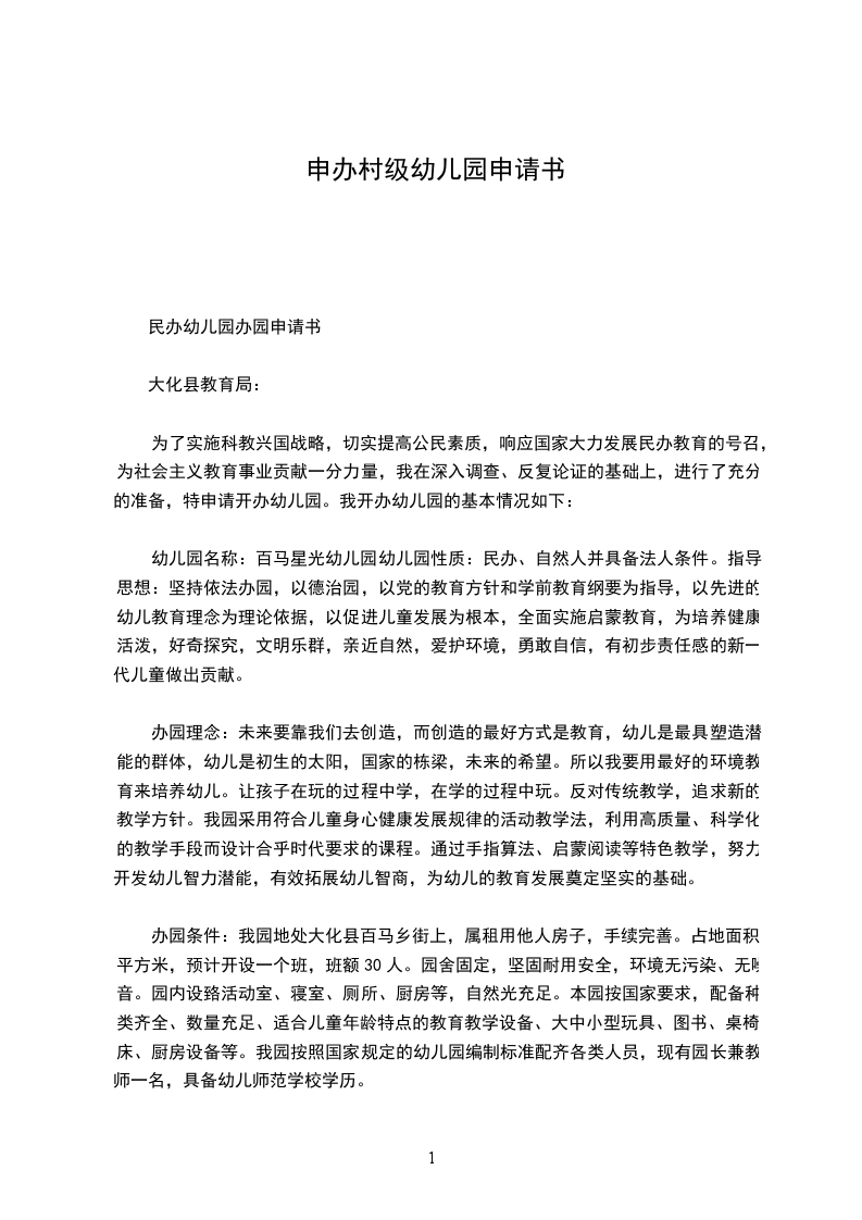民办幼儿园办园申请书
