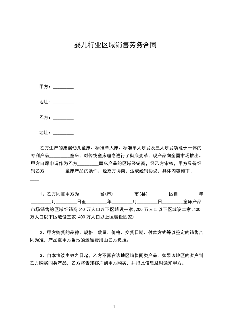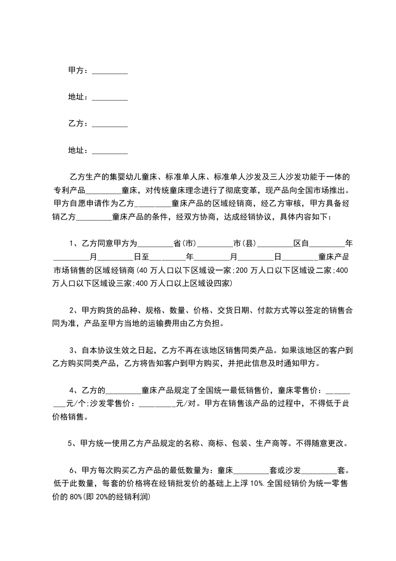 1、乙方同意甲方为_________省(市)_________市(县)_________区自_________年_________月_________日至_________年_________月_________日_________童床产品市场销售的区域经销商(40万人口以下区域设一家;200万人口以下区域设二家;400万人口以下区域设三家;400万人口以上区域设四家)