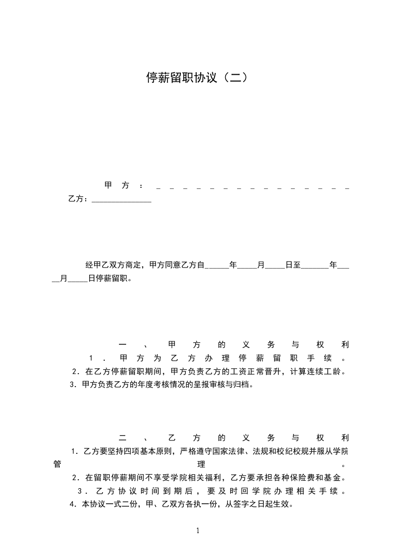 2.在留职停薪期间不享受学院相关福利,乙方要承担各种保险费和基金。