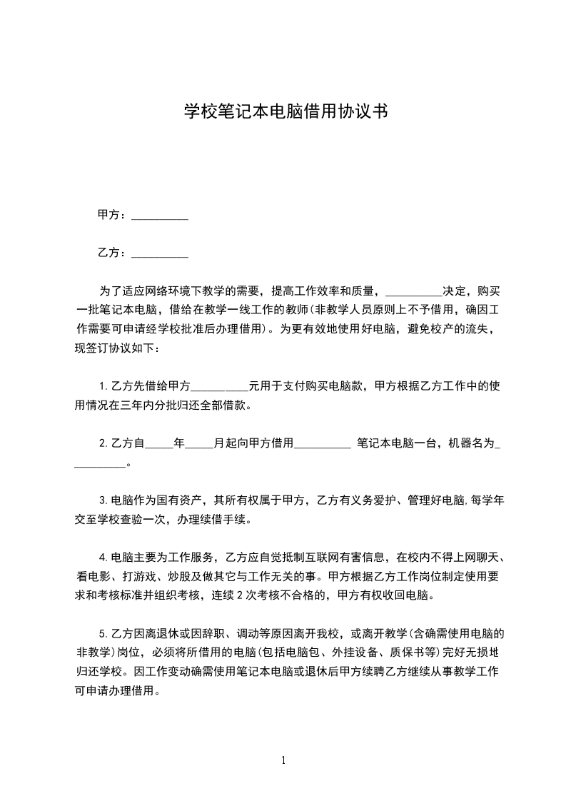 为了适应网络环境下教学的需要,提高工作效率和质量,__________决定,购买一批笔记本电脑,借给在教学一线工作的教师(非教学人员原则上不予借用,确因工作需要可申请经学校批准后办理借用)。为更有效地使用好电脑,避免校产的流失,现签订协议如下: