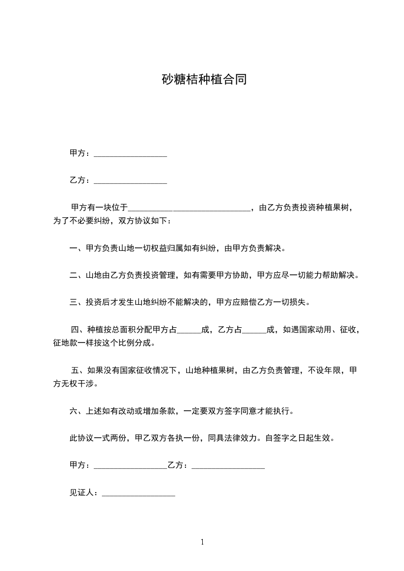 5、合同期内若国家依法征用本果园土地,土地补偿费归;补偿费归。若临时占地所给复耕费归乙方所有,乙方已交甲方需尚未到期的承包款甲乙双方重新核计由甲方退还乙方。固定设施补偿费谁投资归谁所有。