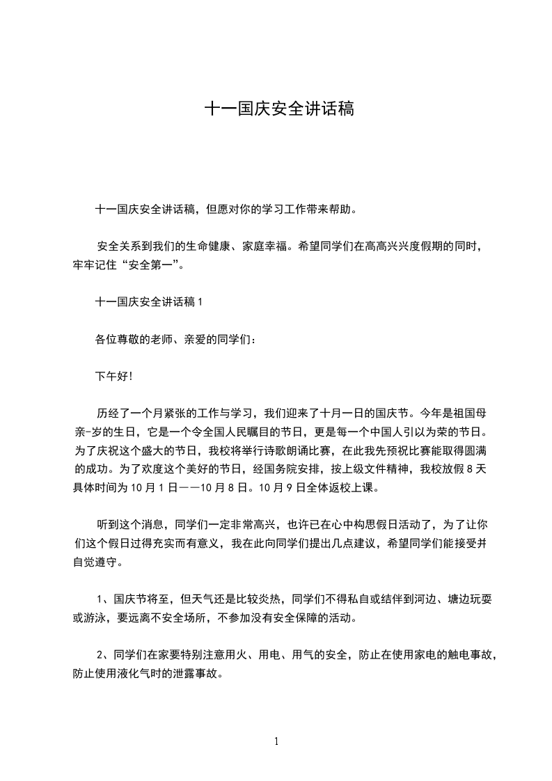十一国庆安全讲话稿1