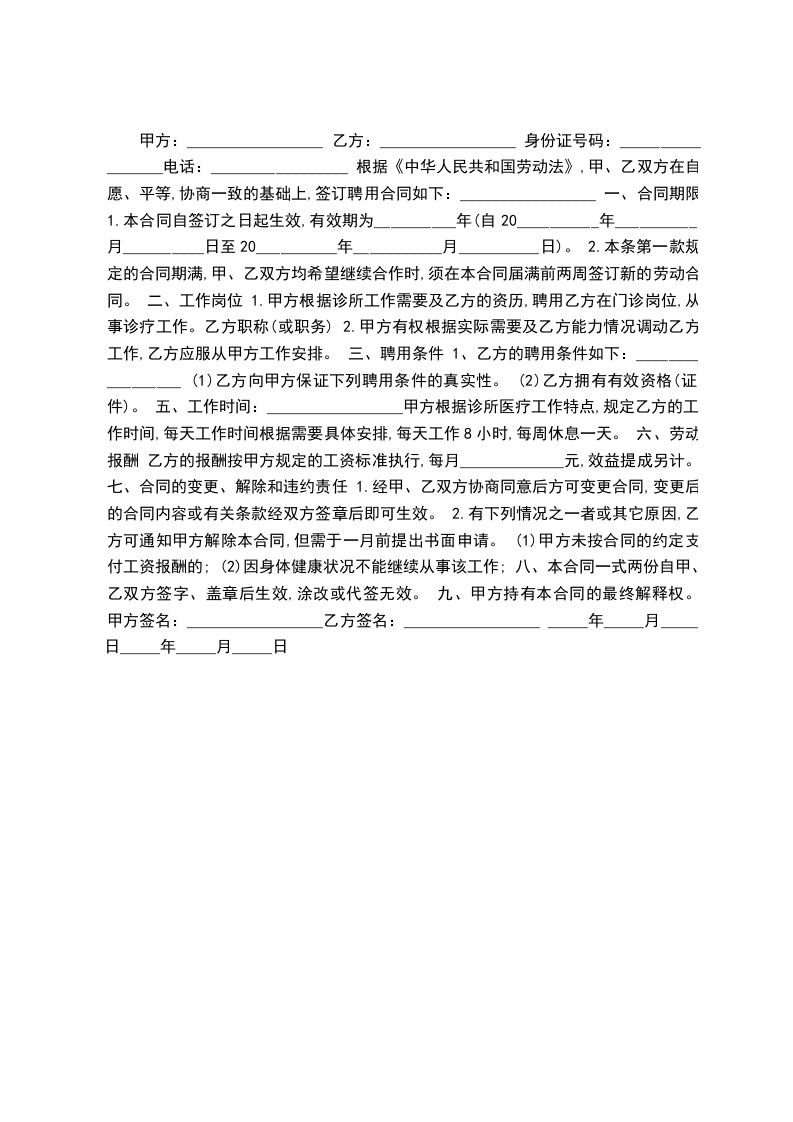 甲方:_________________ 乙方:_________________ 身份证号码:_________________电话:_________________ 根据《中华人民共和国劳动法》,甲、乙双方在自愿、平等,协商一致的基础上,签订聘用合同如下:_________________ 一、合同期限 1.本合同自签订之日起生效,有效期为__________年(自20__________年__________月__________日至20__________年___________月__________日)。 2.本条第一款规定的合同期满,甲、乙双方均希望继续合作时,须在本合同届满前两周签订新的劳动合同。 二、工作岗位 1.甲方根据诊所工作需要及乙方的资历,聘用乙方在门诊岗位,从事诊疗工作。乙方职称(或职务) 2.甲方有权根据实际需要及乙方能力情况调动乙方工作,乙方应服从甲方工作安排。 三、聘用条件 1、乙方的聘用条件如下:_________________ (1)乙方向甲方保证下列聘用条件的真实性。 (2)乙方拥有有效资格(证件)。 五、工作时间:_________________甲方根据诊所医疗工作特点,规定乙方的工作时间,每天工作时间根据需要具体安排,每天工作8小时,每周休息一天。 六、劳动报酬 乙方的报酬按甲方规定的工资标准执行,每月_____________元,效益提成另计。 七、合同的变更、解除和违约责任 1.经甲、乙双方协商同意后方可变更合同,变更后的合同内容或有关条款经双方签章后即可生效。 2.有下列情况之一者或其它原因,乙方可通知甲方解除本合同,但需于一月前提出书面申请。 (1)甲方未按合同的约定支付工资报酬的; (2)因身体健康状况不能继续从事该工作; 八、本合同一式两份自甲、乙双方签字、盖章后生效,涂改或代签无效。 九、甲方持有本合同的最终解释权。 甲方签名:_________________乙方签名:_________________ _____年_____月_____日_____年_____月_____日
