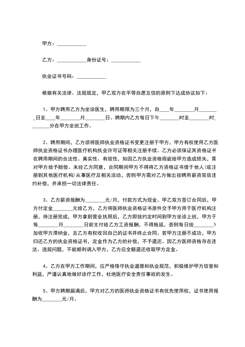 一、甲方有一门诊营业执照,租用乙方医师证为法人,办理登记和年检等事项,并共同经营此门诊,营业执照为甲方所有。