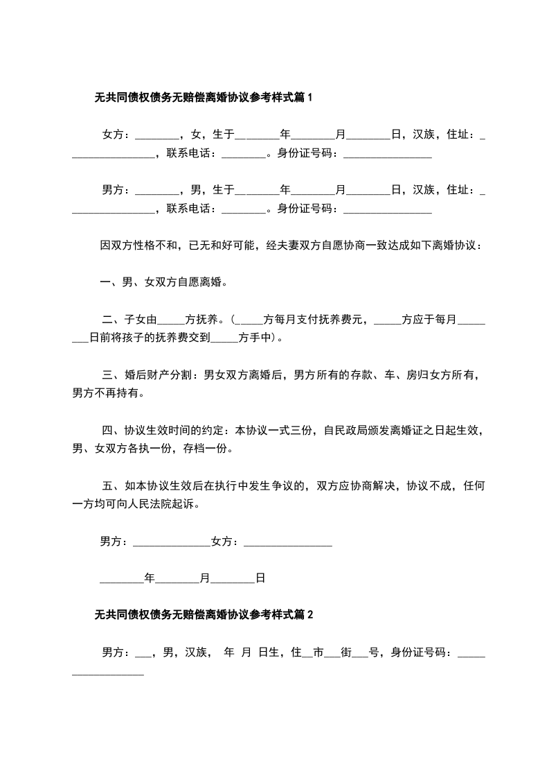 因协议人双方性格不合,夫妻感情破裂,无法继续共同生活,已无和好可能。现双方就自愿离婚一事达成如下协议: