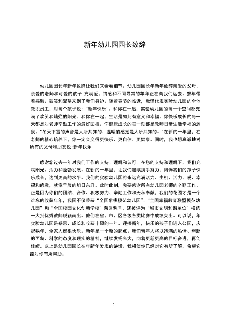 幼儿园园长年新年致辞让我们来看看细节。幼儿园园长年新年致辞亲爱的父母,亲爱的老师和可爱的孩子:充满爱、情感和不同寻常的羊年正在离我们远去。猴年带着感激、微笑和渴望来到了我们身边。随着春节的临近,我谨代表实验幼儿园的全体教职员工,对每个孩子说:“新年快乐”。和你在一起,实验幼儿园的每一个空间都充满了欢笑和灿烂的阳光。和你在一起,生活是如此有意义和幸福。你快乐成长的每一天都是对老师辛勤工作的最好回报。你健康成长的每一刻都是教师日常生活幸福的源泉。"冬天下雪的声音是人所共知的,温暖的感觉是人所共知的。"在新的一年里,在老师的精心培养下,你一定会变得更快乐、更自信、更健康。同时,我也想真诚地对所有的父母和朋友说:新年快乐
