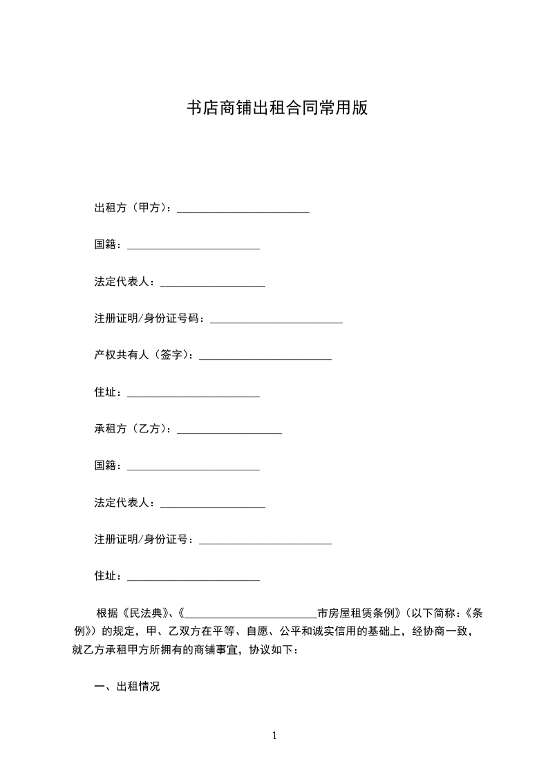 书店商铺出租合同常用版