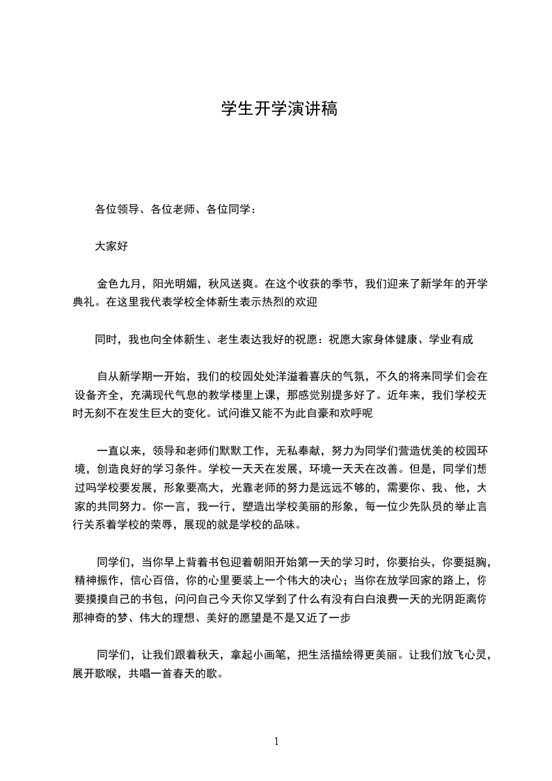 金色九月,阳光明媚,秋风送爽。在这个收获的季节,我们迎来了新学年的开学典礼。在这里我代表学校全体新生表示热烈的欢迎