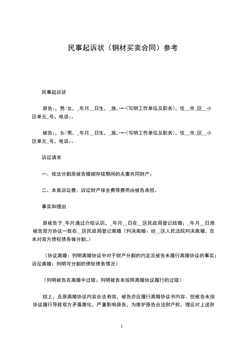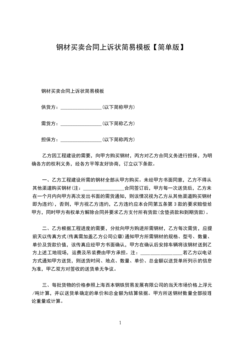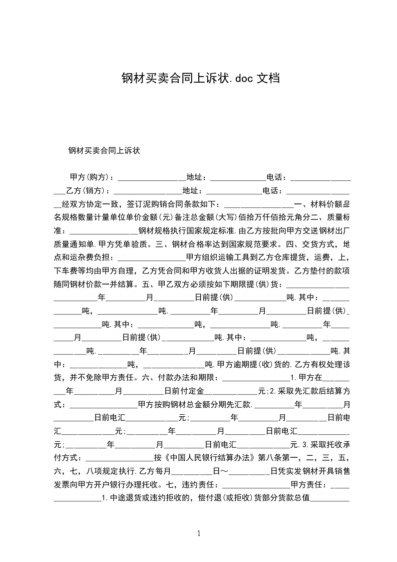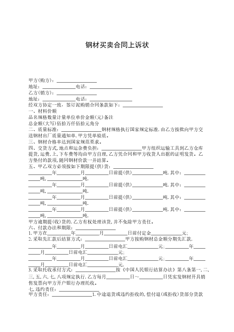 甲方(购方):_________________ 地址:______________电话:__________________ 乙方(销方):_________________ 地址:______________电话:__________________ 经双方协定一致,签订泥购销合同条款如下:_________________ 一、材料价额 品名规格数量计量单位单价金额(元)备注 总金额(大写)佰拾万仟佰拾元角分 二、质量标准:_________________钢材规格执行国家规定标准.由乙方按批向甲方交送钢材出厂质量通知单.甲方凭单验质。 三、钢材合格率达到国家规范要求。 四、交货方式,地点和运杂费负担:_________________甲方组织运输工具到乙方仓库提货,运费,上,下车费等均由甲方自理,乙方凭合同和甲方收货人出据的证明发货。乙方垫付的款项,随同钢材价款一并结算。 五、甲乙双方必须按如下期限提(供)货:_________________ __________年__________月__________日前提(供)_____________吨.其中:______________吨,_______________吨. __________年__________月__________日前提(供)_____________吨.其中:______________吨,_______________吨. __________年__________月__________日前提(供)_____________吨.其中:______________吨,_______________吨. __________年__________月__________日前提(供)_____________吨.其中:______________吨,_______________吨. 甲方逾期提(收)货的.乙方有权处理该货,并不免除甲方责任。 六、付款办法和期限:_________________ 1.甲方在__________年__________月__________日前付定金_____________元; 2.采取先汇款后结算方式:_________________甲方按购钢材总金额分期先汇款. __________年__________月__________日前电汇_____________元;__________年__________月__________日前电汇_____________元; __________年__________月__________日前电汇_____________元;__________年__________月__________日前电汇_____________元. 3.采取托收承付方式:_________________按《中国人民银行结算办法》第八条第一,二,三,五,六,七,八项规定执行.乙方每月__________日~__________日凭实发钢材开具销售发票向甲方开户银行办理托收。 七,违约责任:_________________ 甲方责任:_________________1.中途退货或违约拒收的,偿付退(或拒收)货部分货款总值__________%的违约金.逾期提货的,每天偿付逾期提货部分货款总值__________%的违约金,并承担乙方实际支付的代管费用.2.逾期付款的.每天偿付逾期付款总额__________%的违约金. 乙方责任:_________________1.不能交货的,偿付不能交货部分货款总值5%的违约金;逾期交货的,按逾期交货部分货款总值计算,每天偿付__________%的违约金. 2.所交钢材质量,规格不符合同规定,除自费负责处理外,还要赔偿实际经济损失.