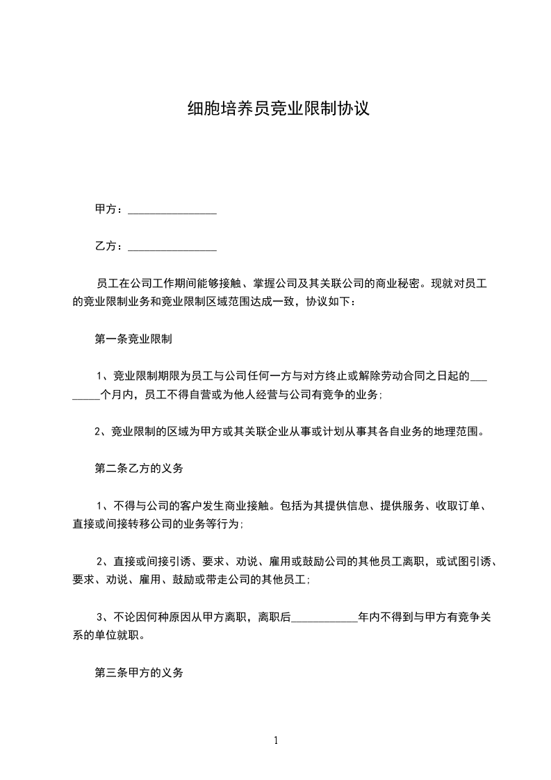 中级细胞培养技术员竞业限制协议