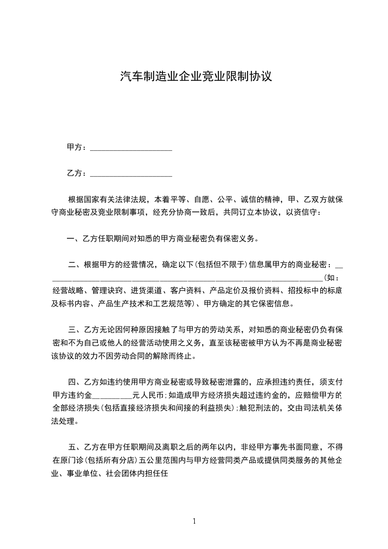 1、未经甲方同意,在职期间不得自营或者为他人经营(包括投资于)与甲方同类的营业。