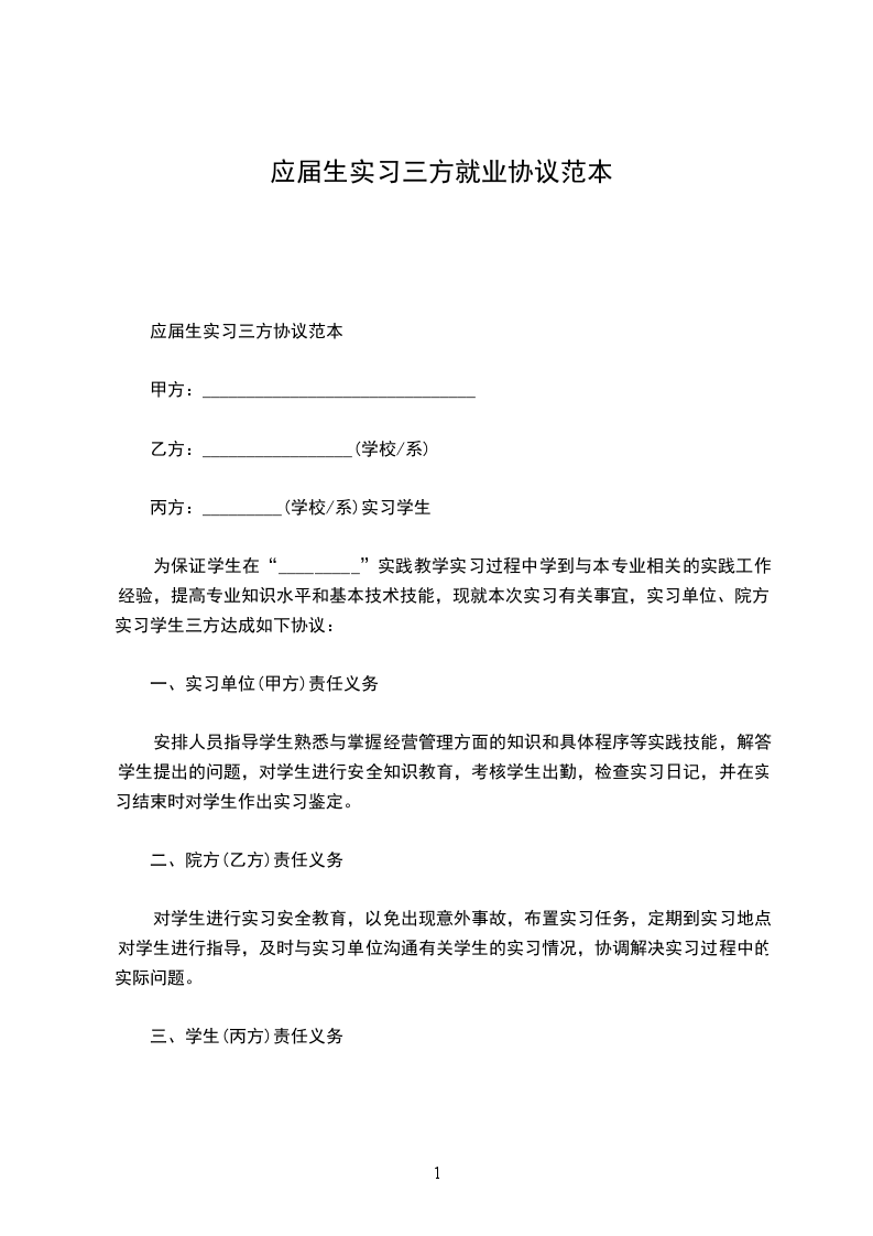 应届生实习三方协议范本