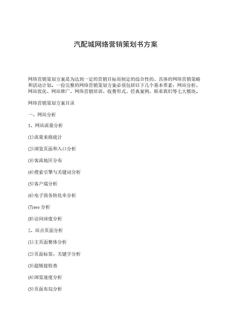 网络营销策划方案是为达到一定的营销目标而制定的综合性的、具体的网络营销策略和活动计划。一份完整的网络营销策划方案必须包括以下几个基本要素:网站分析、网站优化、网站推广、网络营销培训、收费形式、经典案例、联系我们等七大模块。