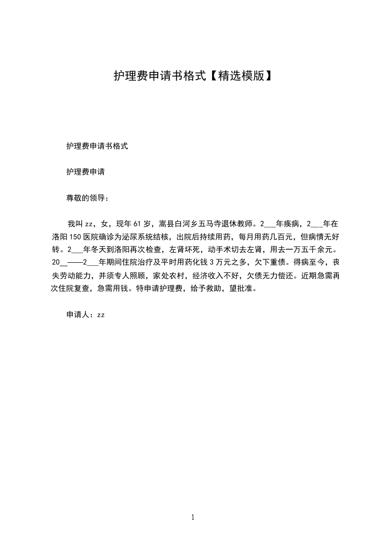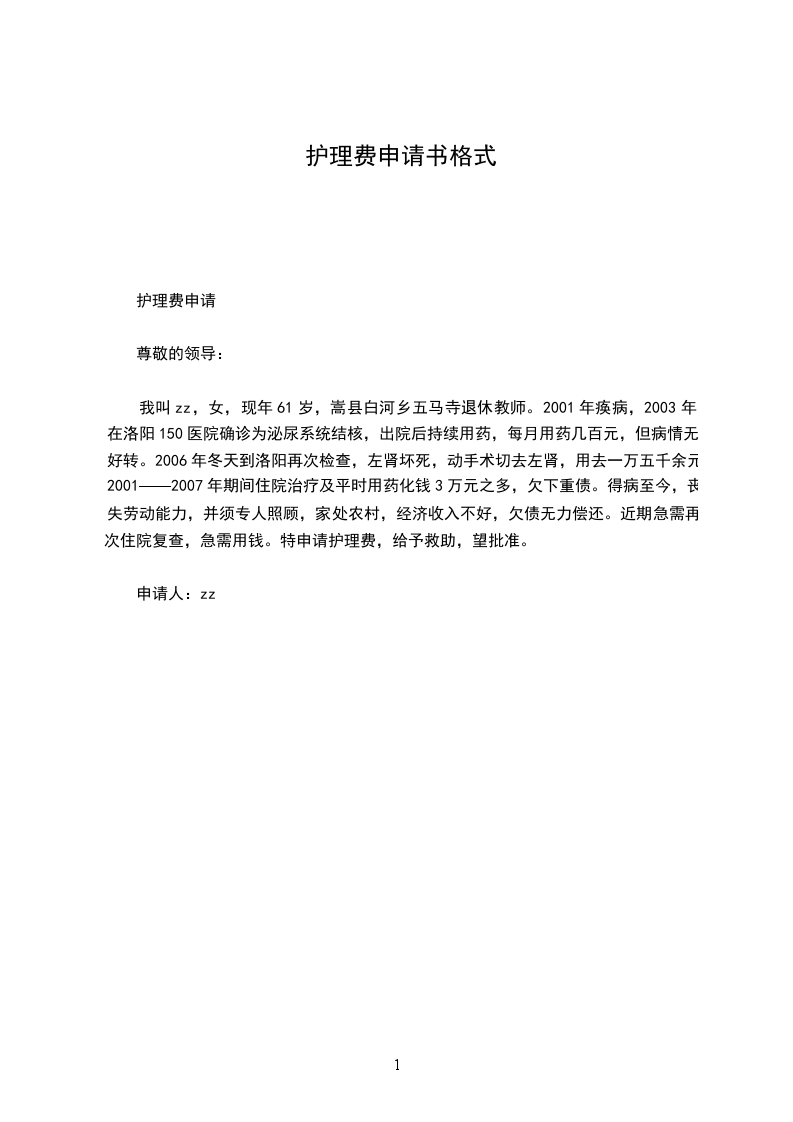 我叫zz,女,现年61岁,嵩县白河乡五马寺退休教师。2001年痪病,2003年在洛阳150医院确诊为泌尿系统结核,出院后持续用药,每月用药几百元,但病情无好转。2006年冬天到洛阳再次检查,左肾坏死,动手术切去左肾,用去一万五千余元。2001——2007年期间住院治疗及平时用药化钱3万元之多,欠下重债。得病至今,丧失劳动能力,并须专人照顾,家处农村,经济收入不好,欠债无力偿还。近期急需再次住院复查,急需用钱。特申请护理费,给予救助,望批准。