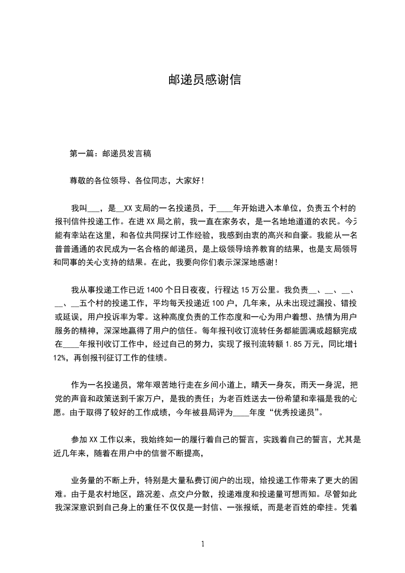 我叫___,是__XX支局的一名投递员,于____年开始进入本单位,负责五个村的报刊信件投递工作。在进XX局之前,我一直在家务农,是一名地地道道的农民。今天能有幸站在这里,和各位共同探讨工作经验,我感到由衷的高兴和自豪。我能从一名普普通通的农民成为一名合格的邮递员,是上级领导培养教育的结果,也是支局领导和同事的关心支持的结果。在此,我要向你们表示深深地感谢!
