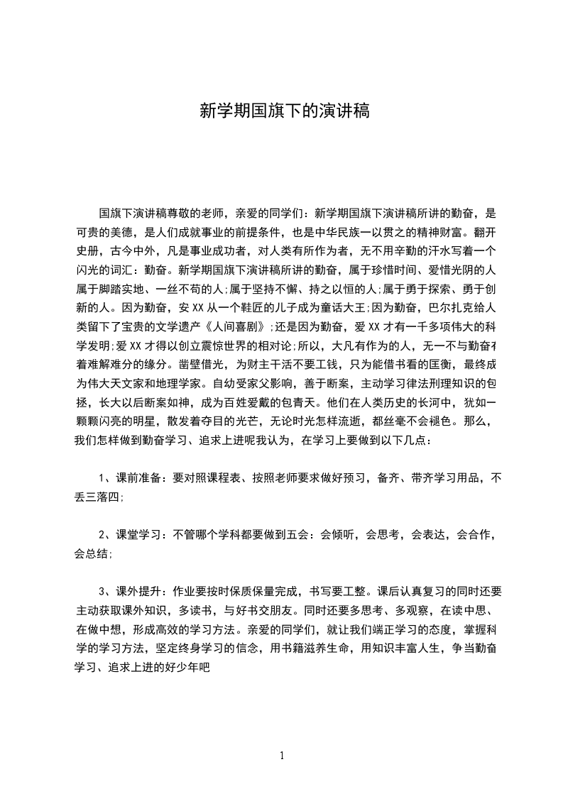 国旗下演讲稿尊敬的老师,亲爱的同学们:新学期国旗下演讲稿所讲的勤奋,是可贵的美德,是人们成就事业的前提条件,也是中华民族一以贯之的精神财富。翻开史册,古今中外,凡是事业成功者,对人类有所作为者,无不用辛勤的汗水写着一个闪光的词汇:勤奋。新学期国旗下演讲稿所讲的勤奋,属于珍惜时间、爱惜光阴的人;属于脚踏实地、一丝不苟的人;属于坚持不懈、持之以恒的人;属于勇于探索、勇于创新的人。因为勤奋,安XX从一个鞋匠的儿子成为童话大王;因为勤奋,巴尔扎克给人类留下了宝贵的文学遗产《人间喜剧》;还是因为勤奋,爱XX才有一千多项伟大的科学发明;爱XX才得以创立震惊世界的相对论;所以,大凡有作为的人,无一不与勤奋有着难解难分的缘分。凿壁借光,为财主干活不要工钱,只为能借书看的匡衡,最终成为伟大天文家和地理学家。自幼受家父影响,善于断案,主动学习律法刑理知识的包拯,长大以后断案如神,成为百姓爱戴的包青天。他们在人类历史的长河中,犹如一颗颗闪亮的明星,散发着夺目的光芒,无论时光怎样流逝,都丝毫不会褪色。那么,我们怎样做到勤奋学习、追求上进呢我认为,在学习上要做到以下几点: