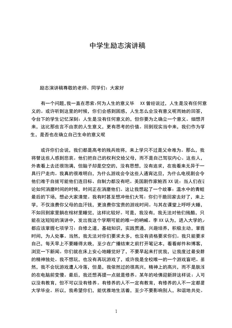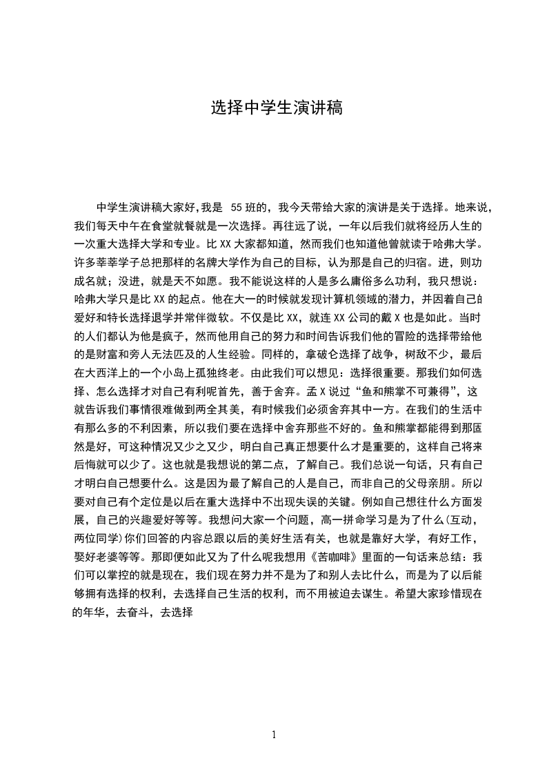 中学生演讲稿大家好,我是55班的,我今天带给大家的演讲是关于选择。地来说,我们每天中午在食堂就餐就是一次选择。再往远了说,一年以后我们就将经历人生的一次重大选择大学和专业。比XX大家都知道,然而我们也知道他曾就读于哈弗大学。许多莘莘学子总把那样的名牌大学作为自己的目标,认为那是自己的归宿。进,则功成名就;没进,就是天不如愿。我不能说这样的人是多么庸俗多么功利,我只想说:哈弗大学只是比XX的起点。他在大一的时候就发现计算机领域的潜力,并因着自己的爱好和特长选择退学并常伴微软。不仅是比XX,就连XX公司的戴X也是如此。当时的人们都认为他是疯子,然而他用自己的努力和时间告诉我们他的冒险的选择带给他的是财富和旁人无法匹及的人生经验。同样的,拿破仑选择了战争,树敌不少,最后在大西洋上的一个小岛上孤独终老。由此我们可以想见:选择很重要。那我们如何选择、怎么选择才对自己有利呢首先,善于舍弃。孟X说过“鱼和熊掌不可兼得”,这就告诉我们事情很难做到两全其美,有时候我们必须舍弃其中一方。在我们的生活中有那么多的不利因素,所以我们要在选择中舍弃那些不好的。鱼和熊掌都能得到那固然是好,可这种情况又少之又少,明白自己真正想要什么才是重要的,这样自己将来后悔就可以少了。这也就是我想说的第二点,了解自己。我们总说一句话,只有自己才明白自己想要什么。这是因为最了解自己的人是自己,而非自己的父母亲朋。所以要对自己有个定位是以后在重大选择中不出现失误的关键。例如自己想往什么方面发展,自己的兴趣爱好等等。我想问大家一个问题,高一拼命学习是为了什么(互动,两位同学)你们回答的内容总跟以后的美好生活有关,也就是靠好大学,有好工作,娶好老婆等等。那即便如此又为了什么呢我想用《苦咖啡》里面的一句话来总结:我们可以掌控的就是现在,我们现在努力并不是为了和别人去比什么,而是为了以后能够拥有选择的权利,去选择自己生活的权利,而不用被迫去谋生。希望大家珍惜现在的年华,去奋斗,去选择