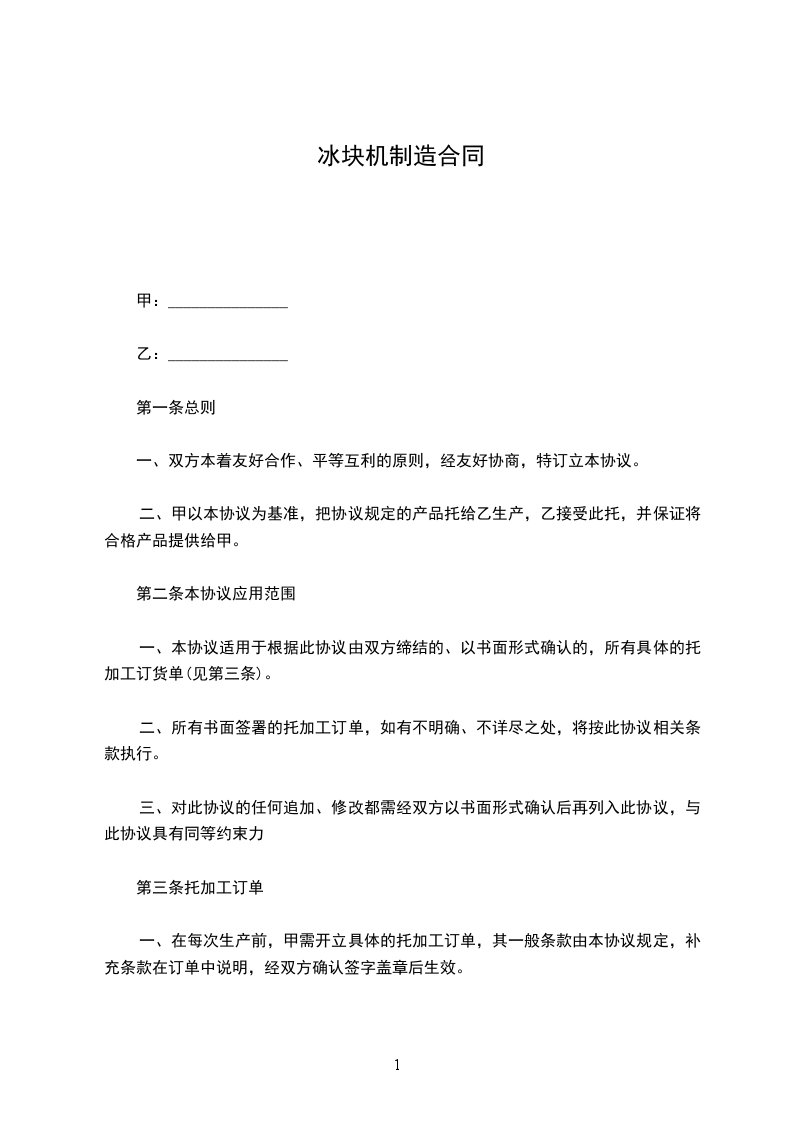 一、在每次生产前,甲需开立具体的托加工订单,其一般条款由本协议规定,补充条款在订单中说明,经双方确认签字盖章后生效。