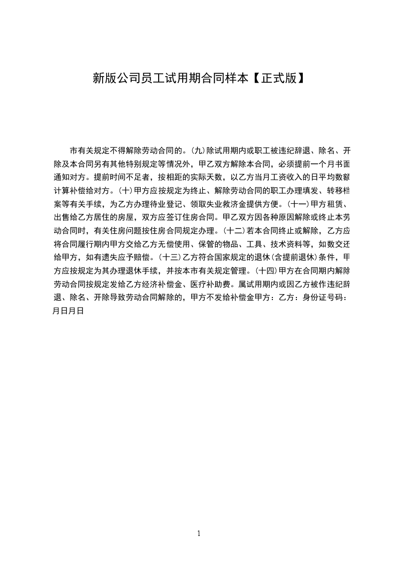 市有关规定不得解除劳动合同的。(九)除试用期内或职工被违纪辞退、除名、开除及本合同另有其他特别规定等情况外,甲乙双方解除本合同,必须提前一个月书面通知对方。提前时间不足者,按相距的实际天数,以乙方当月工资收入的日平均数额计算补偿给对方。(十)甲方应按规定为终止、解除劳动合同的职工办理填发、转移档案等有关手续,为乙方办理待业登记、领取失业救济金提供方便。(十一)甲方租赁、出售给乙方居住的房屋,双方应签订住房合同。甲乙双方因各种原因解除或终止本劳动合同时,有关住房问题按住房合同规定办理。(十二)若本合同终止或解除,乙方应将合同履行期内甲方交给乙方无偿使用、保管的物品、工具、技术资料等,如数交还给甲方,如有遗失应予赔偿。(十三)乙方符合国家规定的退休(含提前退休)条件,甲方应按规定为其办理退休手续,并按本市有关规定管理。(十四)甲方在合同期内解除劳动合同按规定发给乙方经济补偿金、医疗补助费。属试用期内或因乙方被作违纪辞退、除名、开除导致劳动合同解除的,甲方不发给补偿金甲方:乙方:身份证号码:月日月日