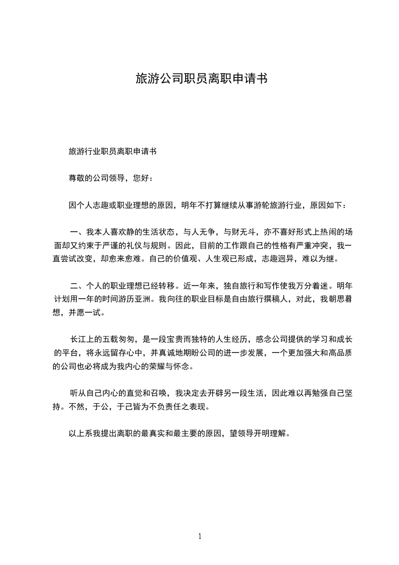 旅游行业职员离职申请书