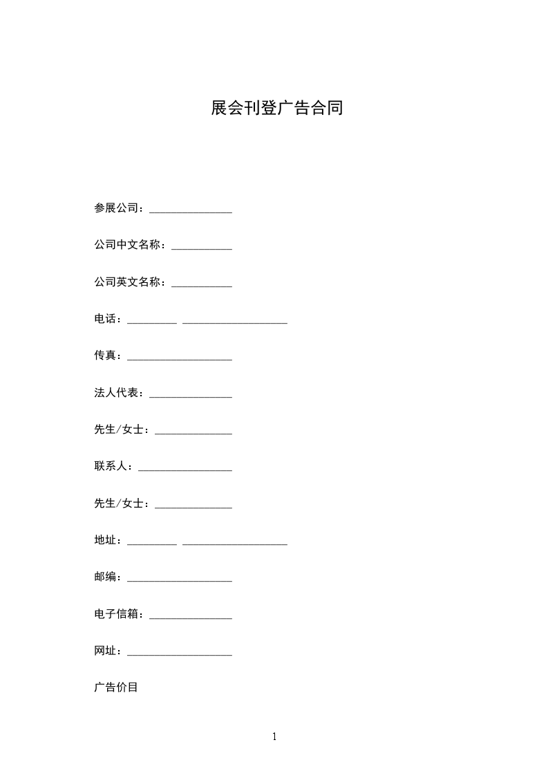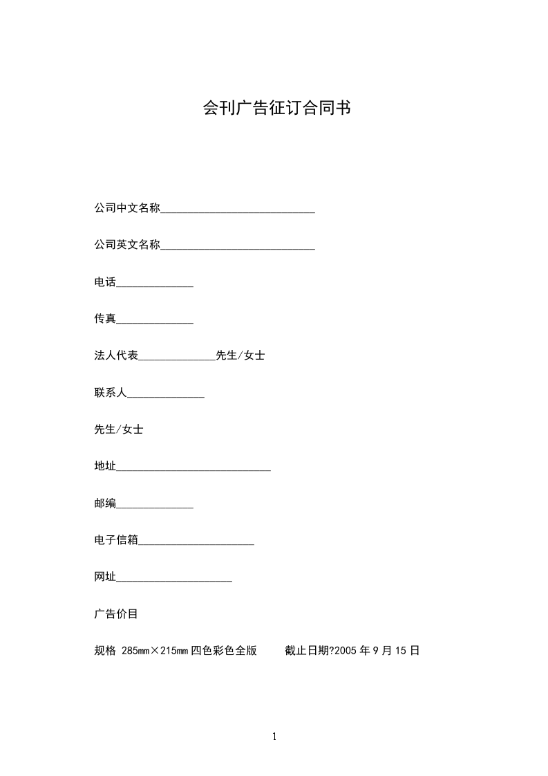 广告合同参展公司公司中文名称公司英文名称电话传真法人代表先士联系人先士地址邮编电子信箱网址广告价目规格285mm215mm四色彩色全版截止日期年9月15日发布位置□封面□封面拉页□封底□封二□封三□□目录前□跨版□内页价格(元)